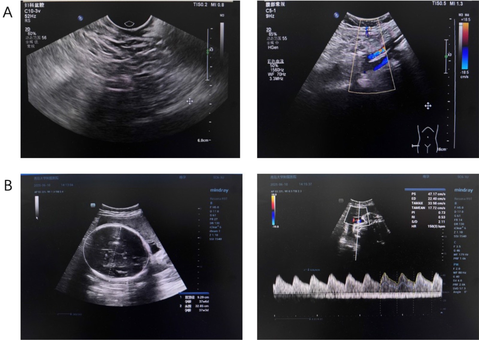 Figure 1. Imaging comparison of prenatal fetal ultrasound and postoperative transvaginal ultrasound. (A) Routine prenatal ultrasonography at 35 + 4 weeks of gestation showed fetal growth consistent with gestational age, with no structural abnormalities detected. (B) Postoperative follow-up transvaginal ultrasonography revealed no residual cervical lesions, and no abnormal findings were observed in the pelvic cavity