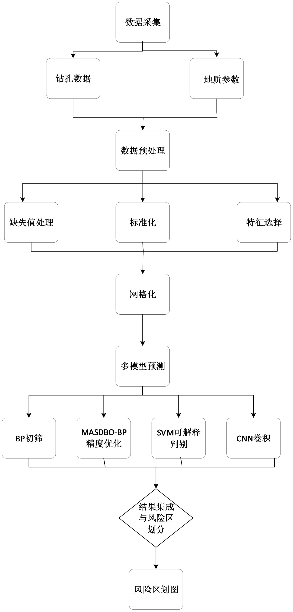 瓦斯突出预测流程包括数据采集、数据预处理、多模型预测与结果集成四个阶段。首先采集煤层地质、钻孔及瓦斯监测数据,涵盖瓦斯压力、瓦斯含量、放散初速度、坚固系数、煤厚、埋深及软分层厚度等关键参数。随后对原始数据进行缺失值修正、标准化与特征筛选,并将钻孔数据网格化(128 × 128)以构建样本集。建模阶段综合采用BP、MSADBO-BP、SVM、RF与CNN等算法,其中BP用于快速初筛,MSADBO-BP提升区划精度,SVM强调小样本可解释性,CNN实现高分辨率网格制图。最终通过模型融合生成风险区划与预测精度评价结果,形成从数据采集到风险图输出的完整预测流程(图1)。