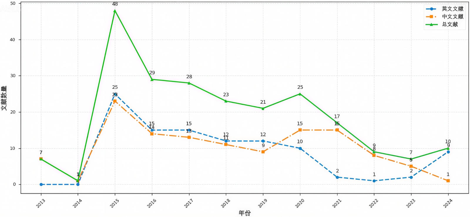 经文献去重筛选后,对最终纳入的225篇研究进行发表年份分析,如图2年度趋势折线图所示,该类研究年发文量于2015年达到峰值(48篇)后呈波动性下降态势。