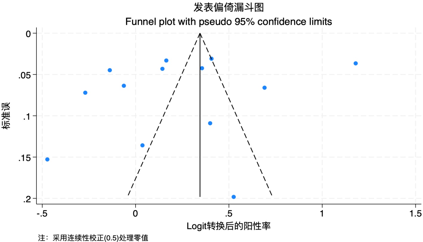 本研究采用了Egger’s检验进行发表偏倚评估,检验结果(P = 0.418 > 0.05)表明不存在显著发表偏倚,见表3。图4漏斗图呈对称分布,进一步证实了结果的可靠性。