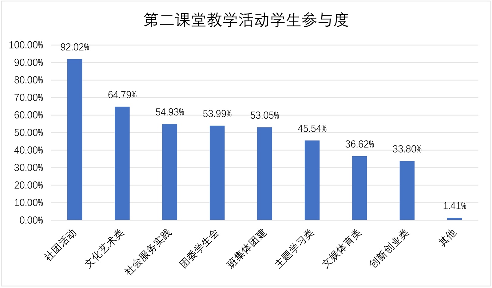 总体来说,社团活动、文化艺术类活动和社会服务实践是艺术类高校学生最常参与的第二课堂教学活动类型,这反映了学生对于个人发展、艺术文化和社会责任感的关注和重视。而参与率较低的活动可能是由于活动内容缺乏吸引力、宣传不足、时间安排冲突等原因所致。