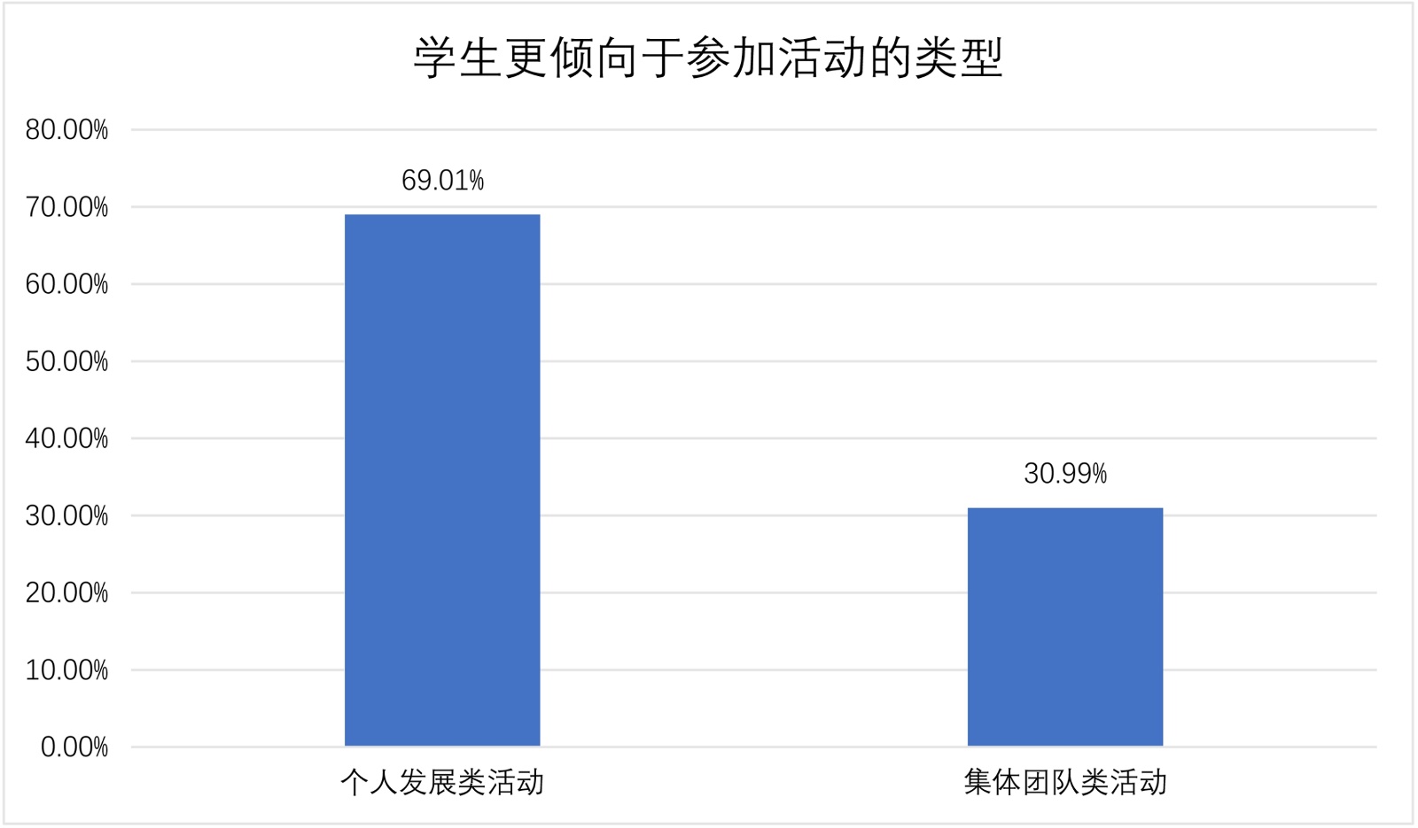 根据调研数据,设计学院独生子女家庭占比65.73%,大部分学生家庭中只有一个孩子。独生子女家庭的孩子从小得到家庭无微不至的照顾,他们在学习与生活中遇到的困难和挫折较少。进入大学后,以前一家人围着一个人转的局面就不存在了,在面对学习或某项工作时,一旦遇到挫折和困难容易灰心丧气,甚至消极回避。艺术类高校学生因其专业特点,通常更专注于自己的专业领域,缺乏集体意识,团队合作能力较弱。从调研问卷“更倾向于参加的活动类型”可以看出,倾向参加个人发展类活动的同学占比69.01%,倾向参加集体团队类活动的同学仅占30.99% (图3)。说明他们更愿意参加一些注重自我个性的表达的活动,反而不太重视集体团队类型的活动。