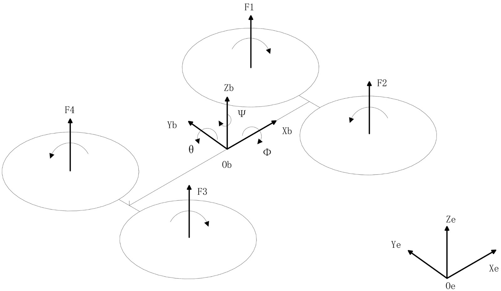 变结构四旋翼陆空机器人在飞行模式下可以视为“H”型结构的四旋翼无人机,即四个旋翼呈矩形分布。为了描述变结构四旋翼机器人的姿态和位置,需要建立与地球中心固连的地球坐标系(oe xe ye ze)和与变结构四旋翼机器人固连的机体坐标系(ob xb yb zb) [7],如图1所示。