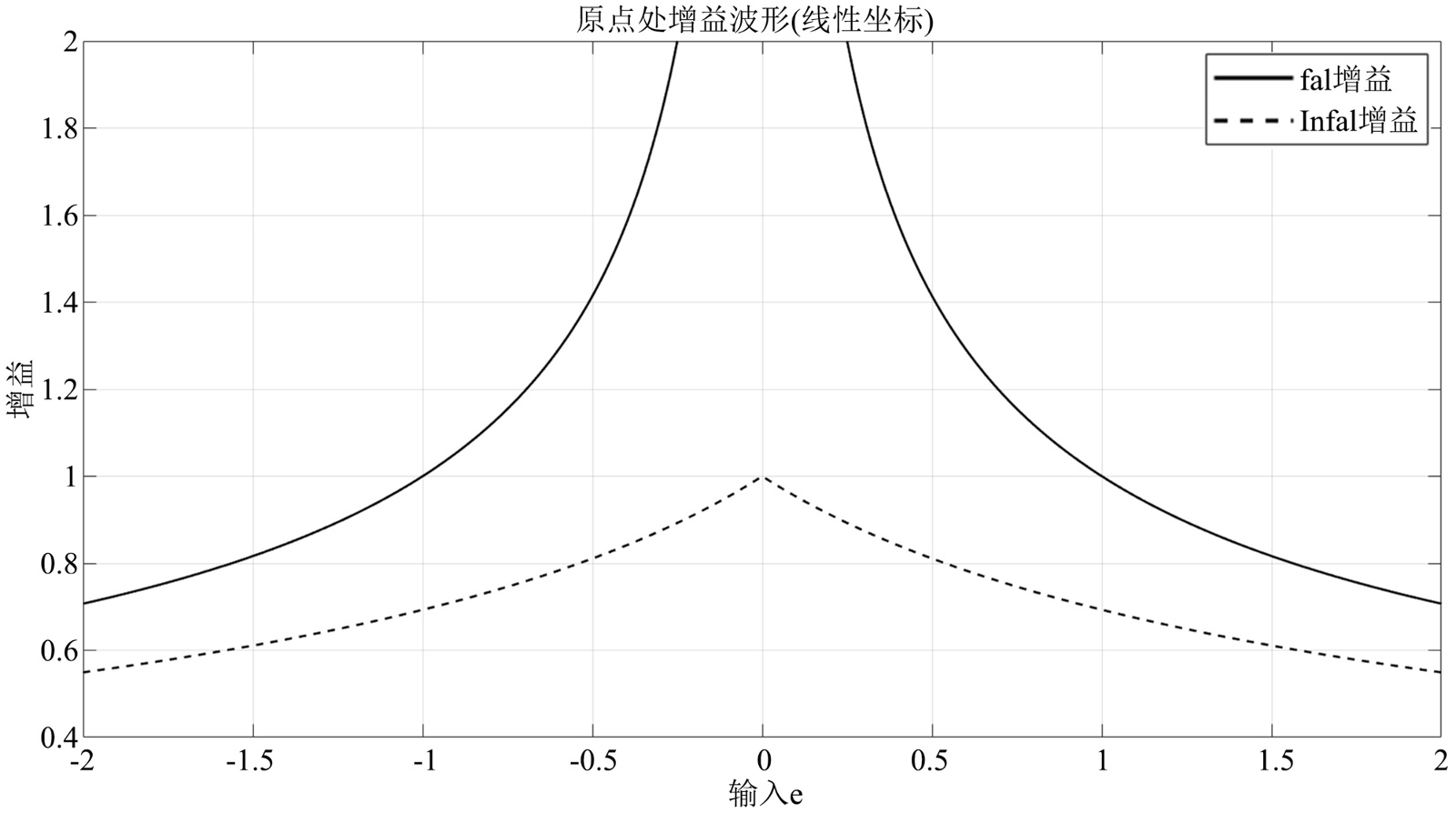 进一步从增益特性角度分析,图3展示了两种函数的增益波形对比。传统fal函数在输入接近零时呈现出典型的“尖峰”形态,虽能有效响应微小误差,但也容易放大噪声成分,不利于系统稳定运行。改进后的fal函数则通过平滑的增益过渡曲线,在保持适当非线性调节能力的同时,有效抑制了增益突变所引起的高频振荡,增强了对噪声的鲁棒性,从而能够更稳定、可靠地估计系统所受的总扰动。