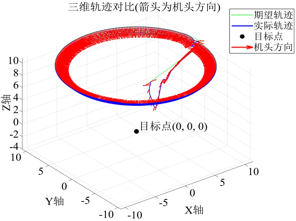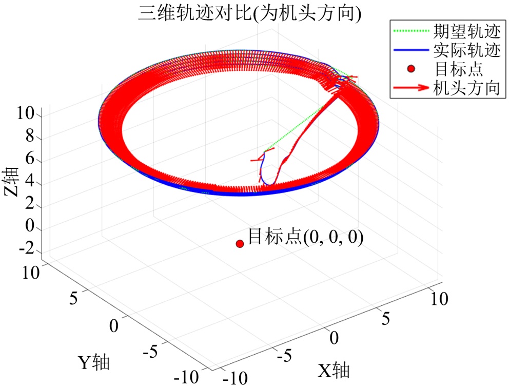变结构四旋翼机器人可实现围绕预设固定点的稳定圆周运动,且在飞行中机头始终朝向目标点并保持45度夹角。为验证所提控制方法的有效性,基于Matlab/Simulink构建了控制系统仿真模型,对比分析了传统ADRC与本文改进ADRC的性能。仿真设定机器人以(0, 0)为中心点,初始盘旋半径10 m,半径随高度线性增加,每绕一圈高度上升0.2 m,偏航角始终指向中心。位置环干扰为2sint,姿态环干扰为[sin2t 0 sin2t]T。ADRC参数整定过程遵循“先内环后外环、先线性后非线性”的递进原则:首先,依据期望的闭环动态响应(如调节时间要求)初步设定控制器带宽;其次,基于分离原理,将观测器带宽设置为控制器带宽的3至10倍,以保证扩张状态观测器具有足够快的扰动估计速度;最后,在固定控制器带宽与观测器带宽的基础上,对非线性函数中的调节参数α与δ进行微调,以优化暂态过程的平滑性与抗突变能力。表1与表2所列参数即按照上述流程,经仿真迭代后确定的综合最优值。