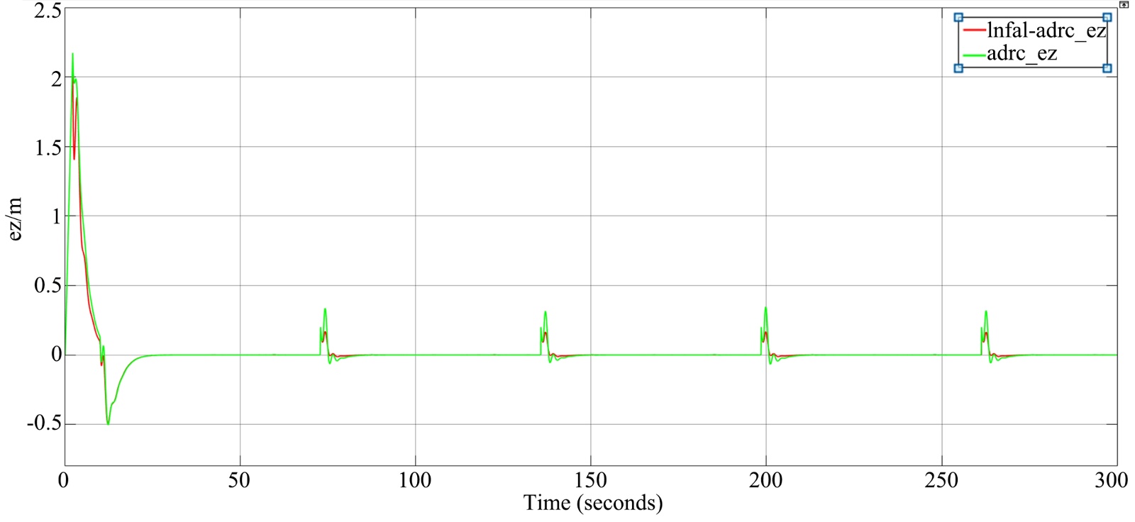 图5显示,在X方向跟踪误差对比中,传统ADRC需36.52秒进入稳态,而本文改进ADRC仅需2.702秒,调节时间缩短约92%。在轨迹突变时,传统ADRC峰值误差为0.305 m,改进方案降至0.25 m,降幅达18%。图6表明,传统方法调节过程需42.929秒,改进后压缩至12.909秒,调节时间缩短约70%。图7显示,传统ADRC峰值误差为2.173 m,改进后降至2.14 m,降幅约3%,虽提升有限,但验证了算法在不同维度的一致性与稳定性。改进ADRC在变结构机器人位置控制中展现出优异的动态性能及响应速度。在阶跃或轨迹突变时,能更快速实现快速跟踪。抗干扰实验表明,该系统在x、y、z三通道的扰动幅值和超调量均显著降低,且恢复稳定时间更短,验证了其在增强系统鲁棒性与动态平稳性方面的有效性和实用性。