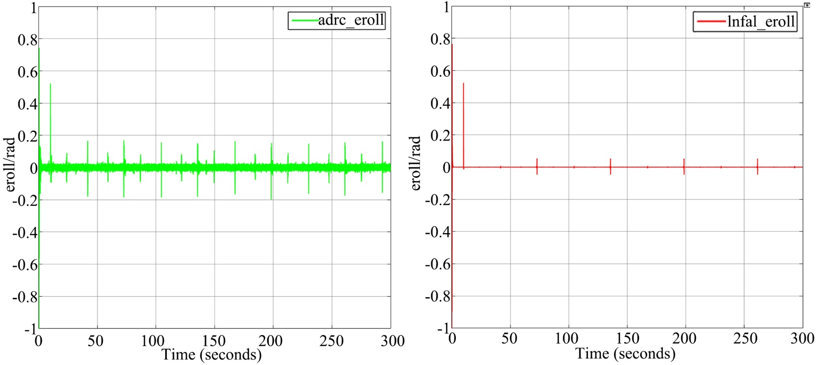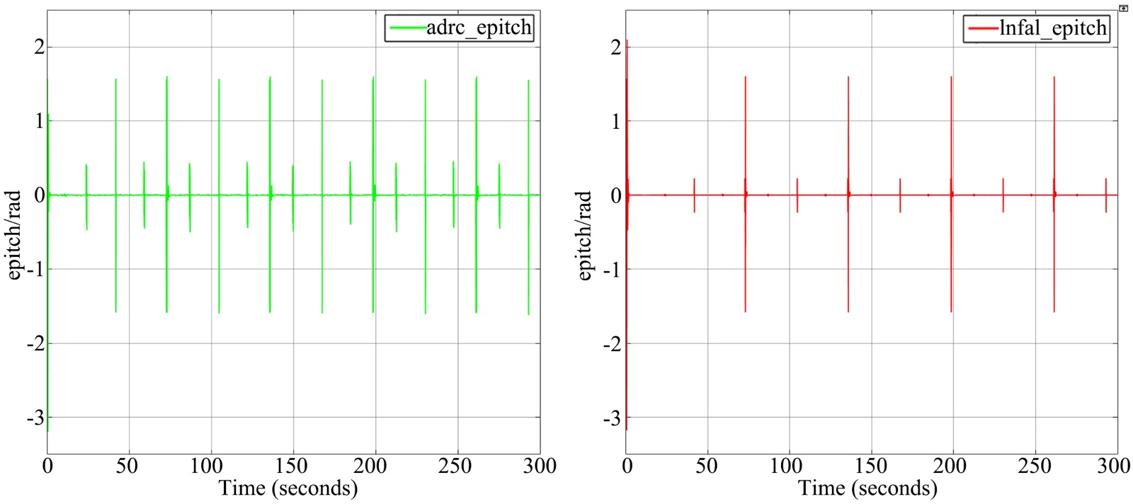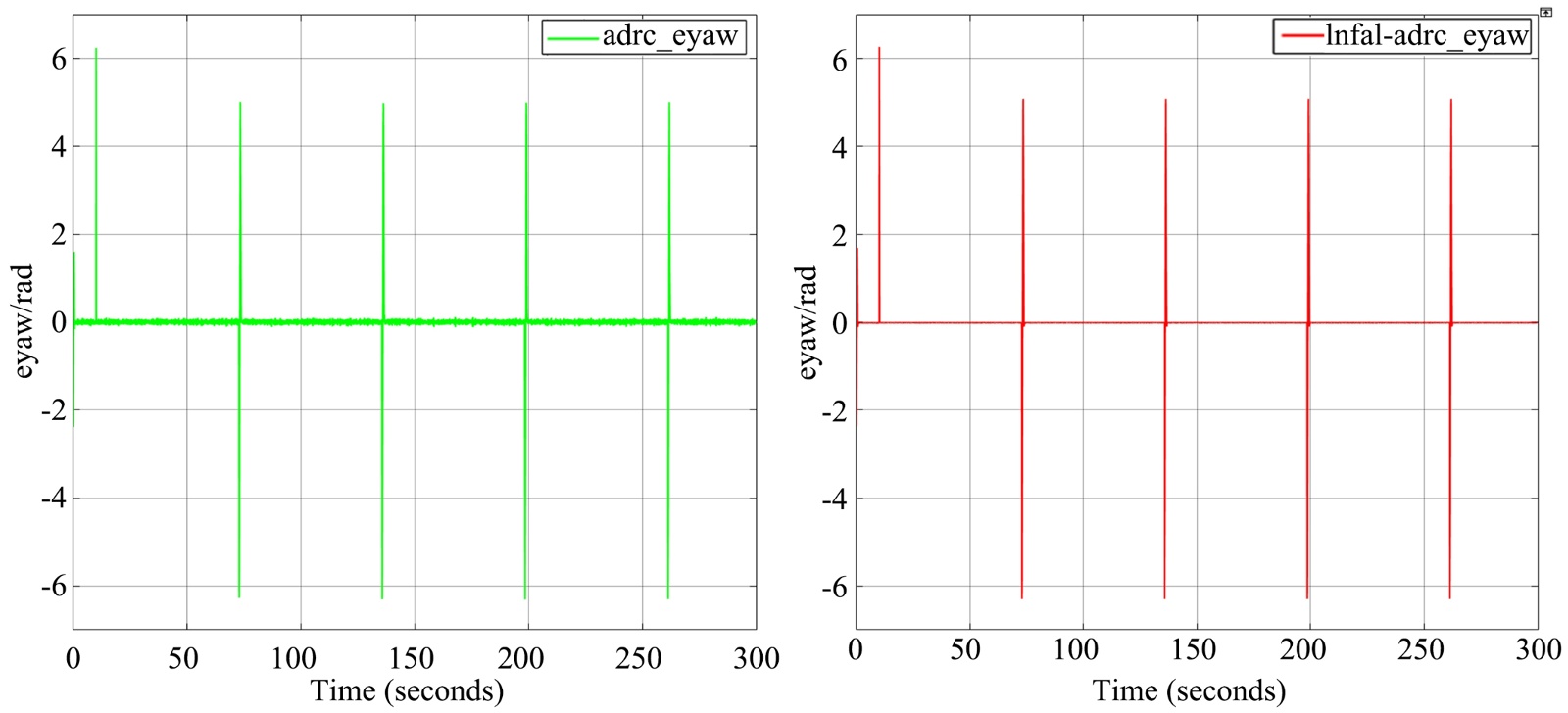 图8对比表明,改进ADRC仅在启动时有短暂波动,随后误差快速收敛,精度高。而传统ADRC在稳态后,滚转角误差仍在[−0.13, 0.13]区间内无规律抖动,无法实现高精度稳定跟踪。图9显示,改进ADRC在轨迹突变时能迅速恢复稳定,其余时段误差近乎为零。传统ADRC在稳态后,俯仰角误差在[−1.586, 1.584]区间内周期性抖动,无法稳定高精度跟踪。图10表明,改进ADRC在轨迹突变时仅有短暂、可接受的误差波动,并能快速恢复稳定;其余时段误差接近零。传统ADRC在稳态后,存在持续高频抖动,虽误差幅值差异不大,但反映了其抑制高频干扰与未建模动态的能力不足。基于改进ADRC控制器的变结构机器人,在姿态角跟踪误差方面较传统ADRC有明显改善,抖振大幅减弱,仅在位置突变时出现短暂较大振幅,且能快速收敛。仿真结果表明,改进ADRC在位置与姿态控制中均具有更快的响应速度和更强的抗干扰能力。