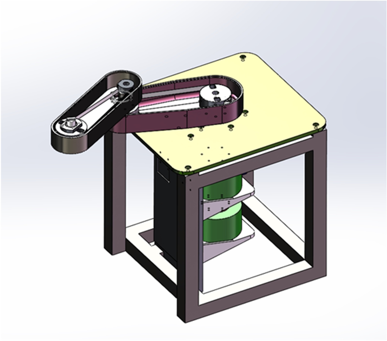 晶圆机器人的机械臂搬运作业对机械臂的轻量化、低惯量与高速平稳运动具有严格要求,钢带传动相较同步带、传动轴及差动机构展现出更突出的综合优势。同步带虽然具有较高刚度,但其带轮尺寸与带宽限制了布置的紧凑性,并会增加前端关节质量,不利于晶圆搬运中对高速与微振动抑制的要求;传动轴虽具备优良扭矩输出能力,但其较大的固有质量和空间需求使其难以满足轻质长臂结构的惯量限制;差动机构则因耦合特性带来控制复杂度与误差叠加问题,不适用于追求简洁运动控制与高洁净性的场景。相比之下,钢带传动以其最小截面、极高路径可塑性和极低质量,可有效降低前端关节惯量,实现高速、低扰动的晶圆搬运轨迹,同时保持传动链平顺、噪声低、粒子生成少等洁净优势,因此对于驱动负载较低的晶圆输送机器人而言,该方案是更为理想的选择,其中,机械臂的大臂部分通过轴套与电机输出端直接连接实现驱动,而小臂则由传动轴带动钢带,并通过钢带与小臂的关节相连,从而完成小臂的运动传递,传动方案如图1和图2所示。基于上述分析,通过SOLIDWORKS建立晶圆输送机器人的三维模型如图3所示。