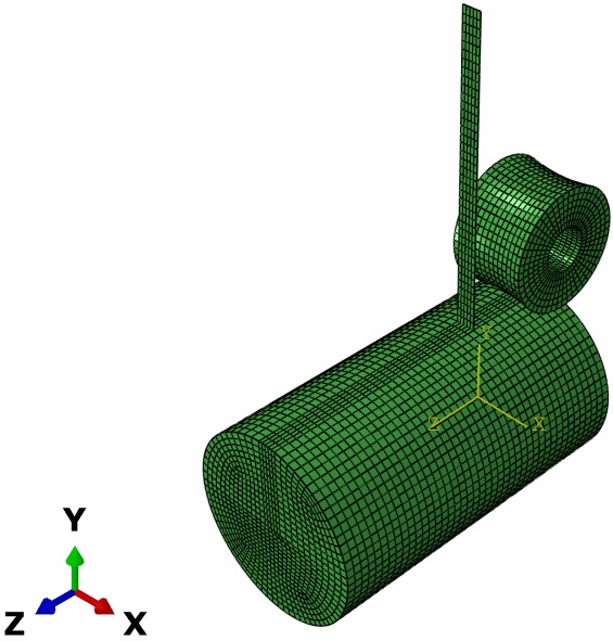 在几何建模基础上,为确保仿真能够准确反映极耳的弯曲与塑性变形行为,本研究对模型采用差异化的单元类型与网格划分策略。极耳厚度仅为0.15 mm,属于典型薄片结构,因此采用四节点减缩积分壳单元S4R,以获得更高的弯曲精度;电堆和压轮作为整体刚性结构,采用三维八节点实体单元C3D8R进行离散。为提高网格质量并保持六面体网格为主的结构,电堆与压轮在划分前进行了必要的几何切分。网格尺寸方面,电堆与压轮均采用1 mm网格,而极耳变形区域进行适当加密,以捕捉应力集中与圆角成形细节。上述单元类型与网格划分策略能够在保证计算精度的同时显著提升求解效率,为后续动力学仿真提供稳定可靠的数值基础。运动路径采用两段式复合运动,第一阶段即下压阶段,沿z轴负方向移动,直至凹面与电堆表面接触;第二阶段为轴向移动阶段,沿x轴正方向移动,位移40 mm,直至将极耳压弯。简化后的模型如图2所示。