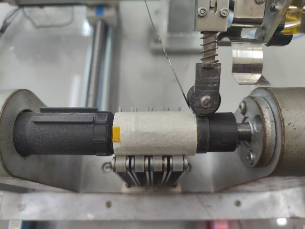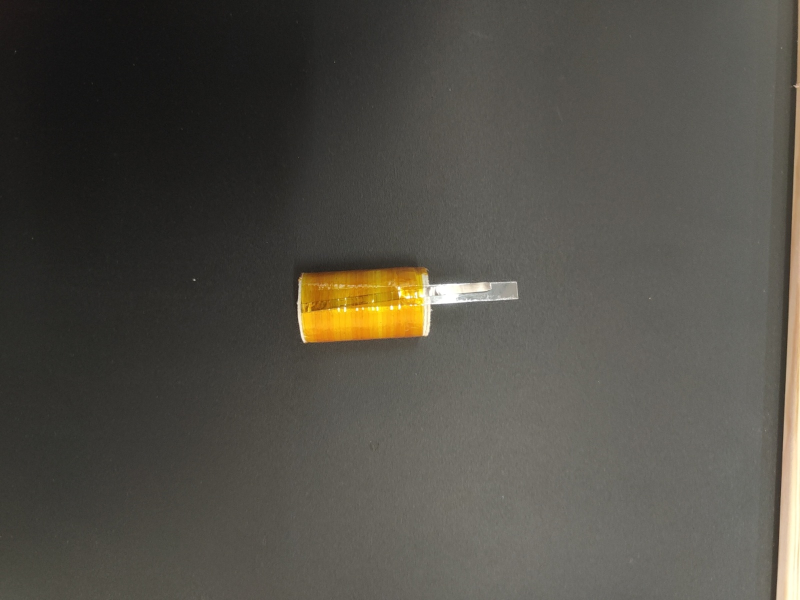 弯折过程中电堆与压轮在机构中的状态如图4所示,可见极耳与焊接点连接稳固,未出现脱落或者形变情况,无开裂现象;轴向对正,无偏移错位,确保了压弯过程的准确性。极线弯折完成后拆卸下的样品如图5所示,从图中可以看出极耳整体贴合于电堆表面,无明显褶皱或翘曲现象,焊接点未出现脱落或变形,极耳边缘与电堆轴线平行度误差在允许范围内[12];同时天然云母片与人造云母片均保持完整,无碎裂、划痕。