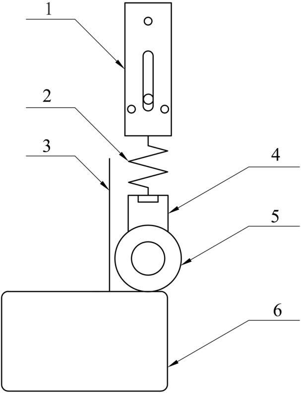 1. 挡叉板 2. 缓冲弹簧 3. 极线 4. 极线弯折杆 5. 凹面压轮 6. 电堆。