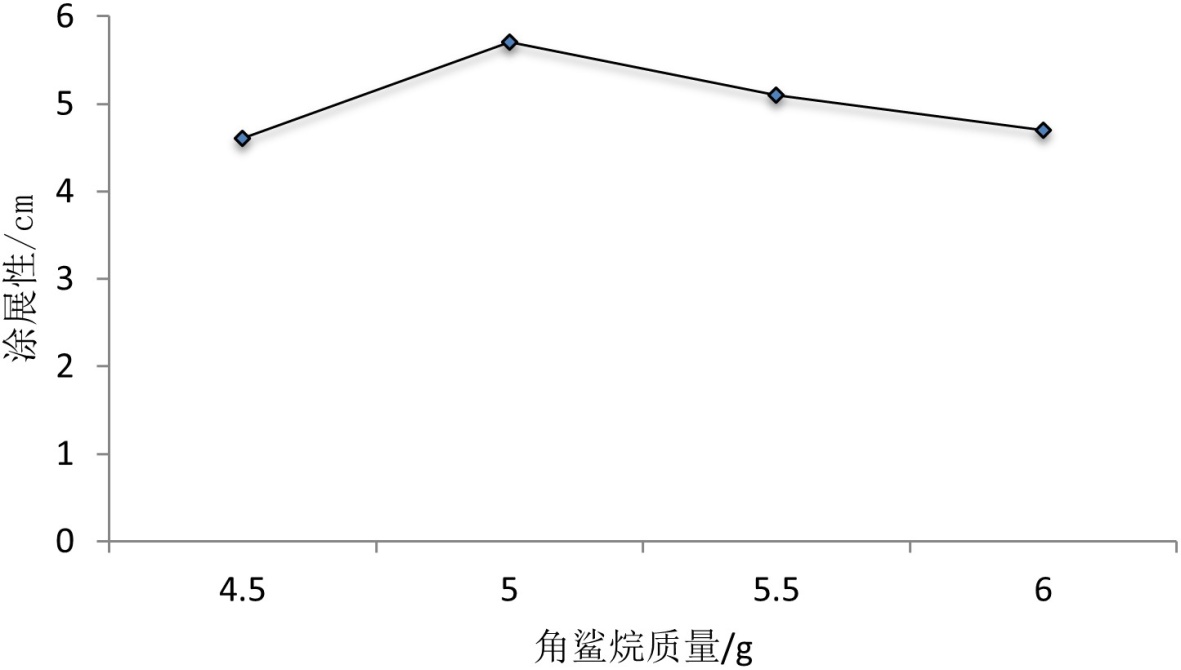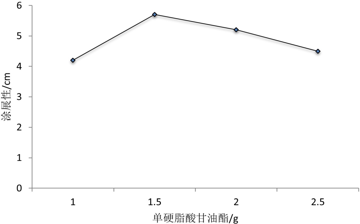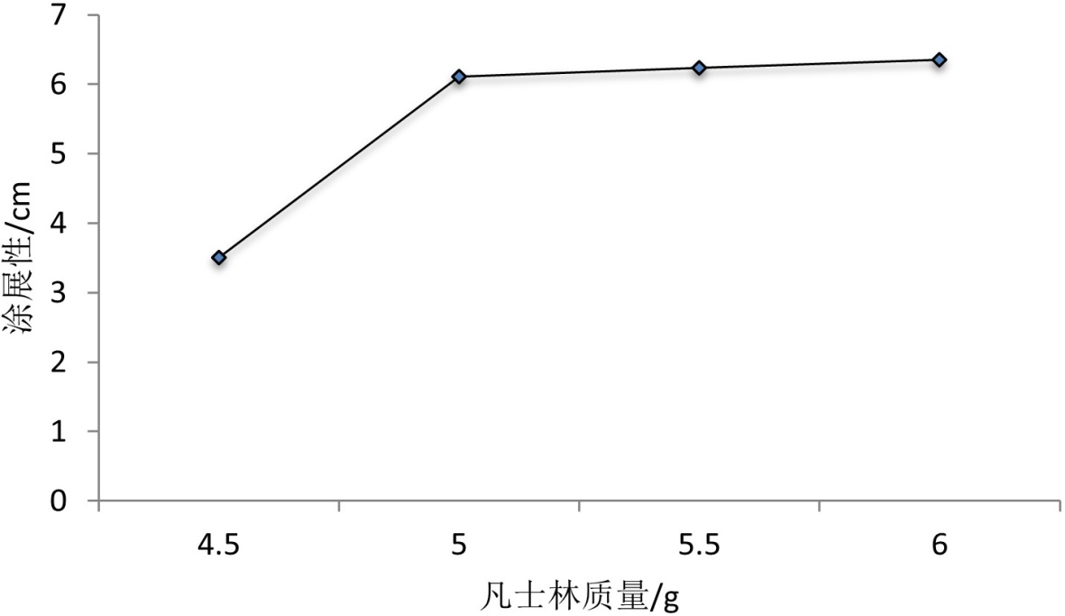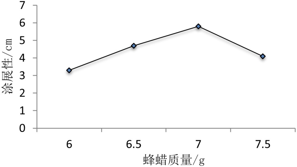 对嘴唇的保护作用也会减弱,达不到相应的效果。由于凡士林在较高温度时不易凝固,凡士林质量过多也会使精油唇膏的凝固性不太好,只要温度升高唇膏表面就会有油脂物质析出。因此综合考虑,凡士林质量在5.00 g时,唇膏的质量最佳,此时涂展性值为6.11 cm。