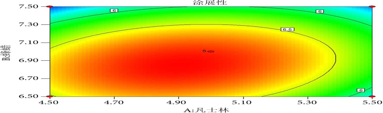 根据上述响应面分析法所得到的最佳工艺条件下,从实际情况看,对结果进行修正,进行验证试验,重复3次实验,测得的鸡蛋花精油唇膏的涂展性的平均值[12]。