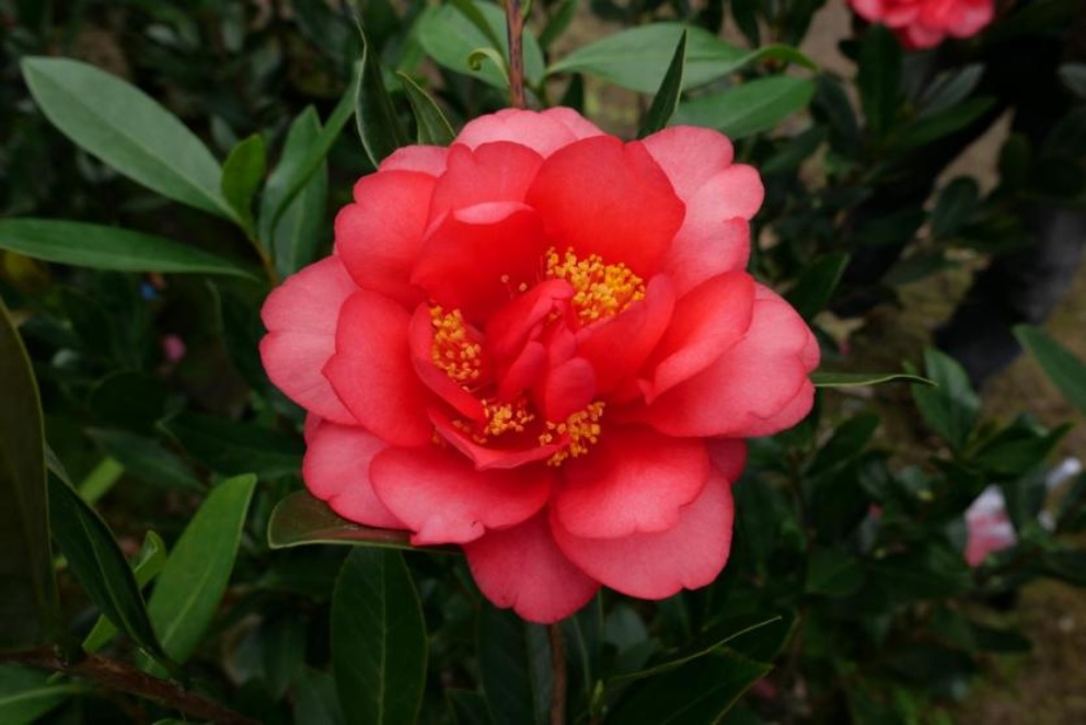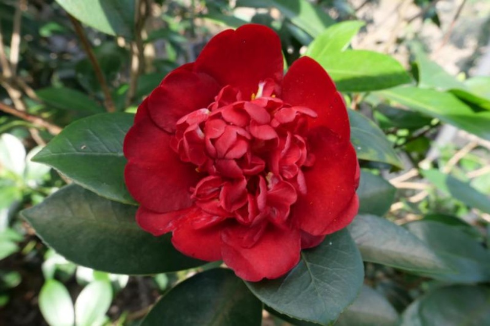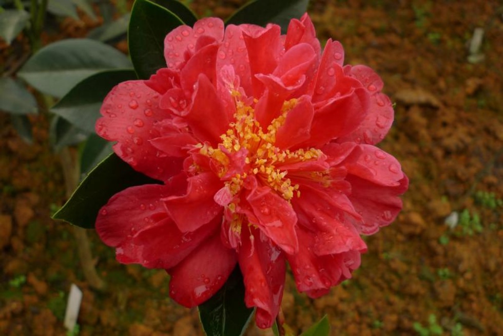 常绿灌木,株型半开张。嫩芽黄绿色,嫩枝红褐色。叶片深绿色,叶背灰绿色,厚革质,椭圆形,长11.5 cm,宽5.5 cm,叶脉明显,横截面平坦,叶尖渐尖,叶柄短,叶缘具稀细齿。花芽腋生兼顶生,萼片紫红色,倒卵形,覆瓦状排列。花大型,直径11.0~16.0 cm,牡丹重瓣型,单色,花瓣内侧主色红色。外轮大花瓣约10枚,略呈波浪状;中部花瓣40枚以上。雄蕊簇生,柱头5裂或多裂,雌雄蕊近等高,见图1。年开花多次,花期长。在广东地区,始花期8月,盛花期10~11月,末花期可至次年1月。初步引种试验表明,其在浙江、陕西等地的整体花期较广东地区晚25~35天。