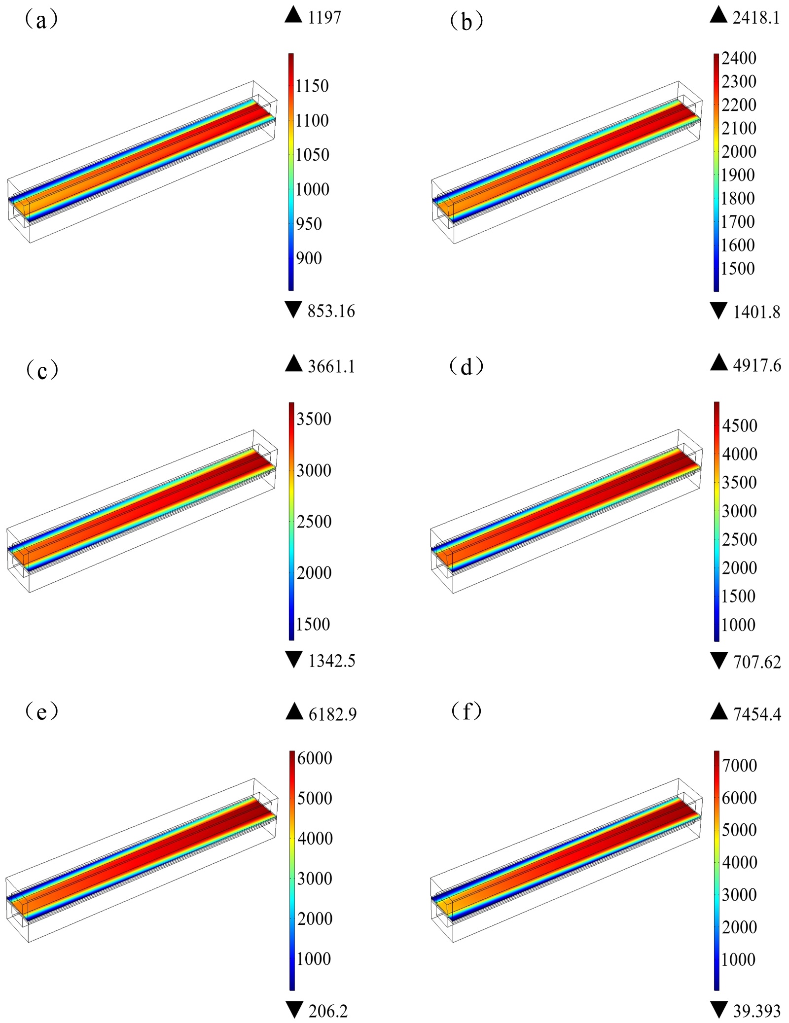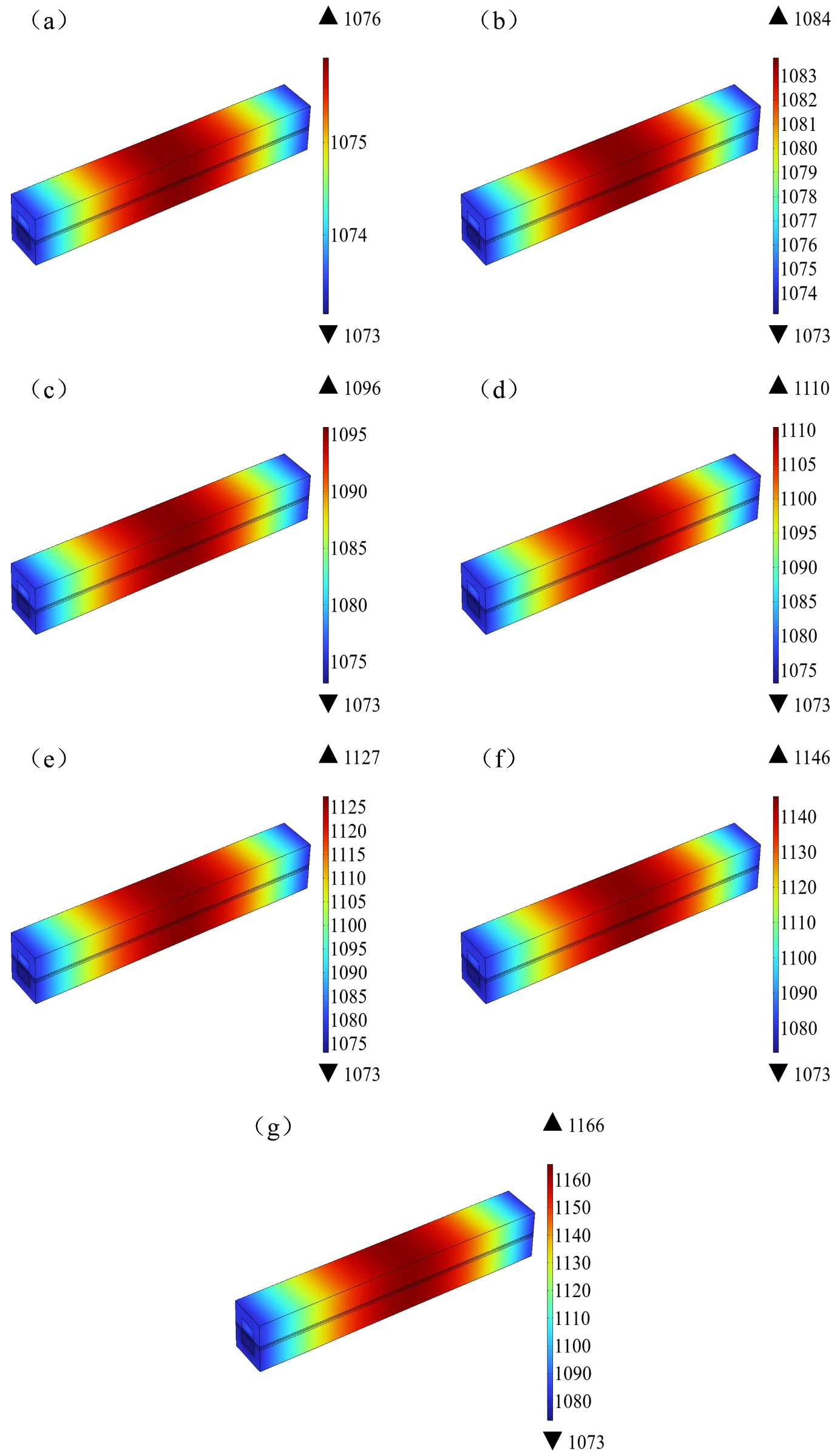 温度分布的均匀性直接影响电池的效率、寿命、稳定性和安全性。为研究不同极化电压下电池内部气体分布情况与电流密度分布情况,在温度为1073 K,压力为1.0133 × 105 Pa,其他参数如表2所示。计算不同极化电压下的电池温度分布情况。