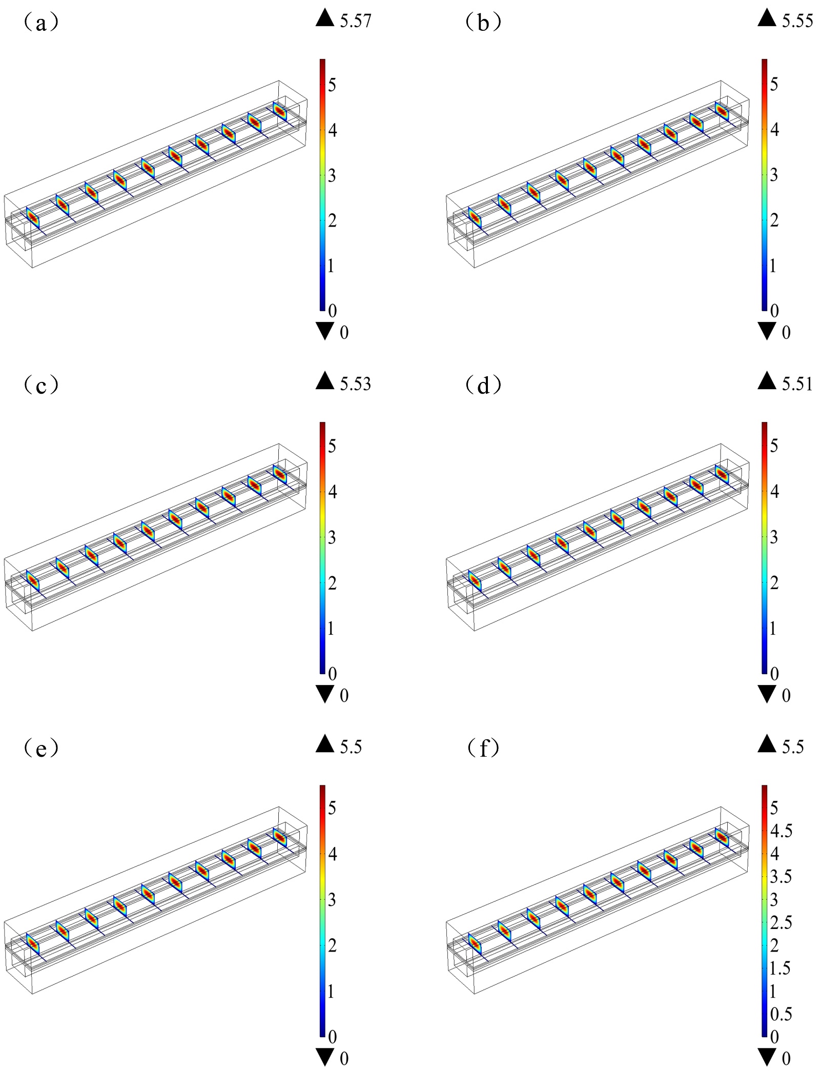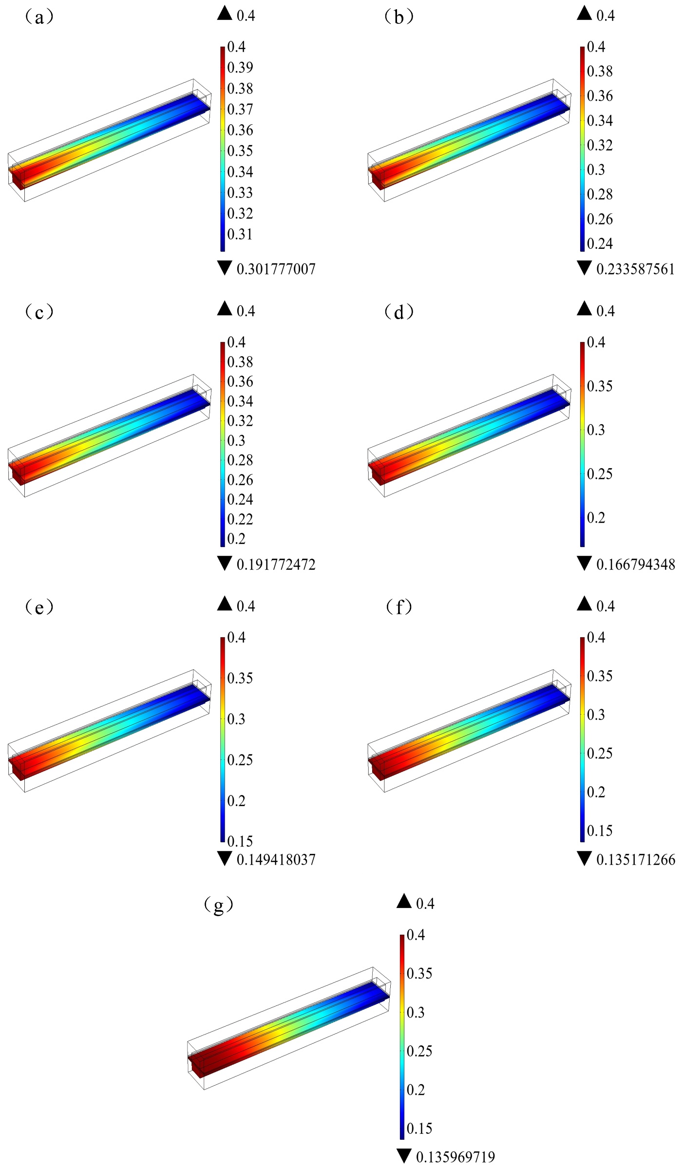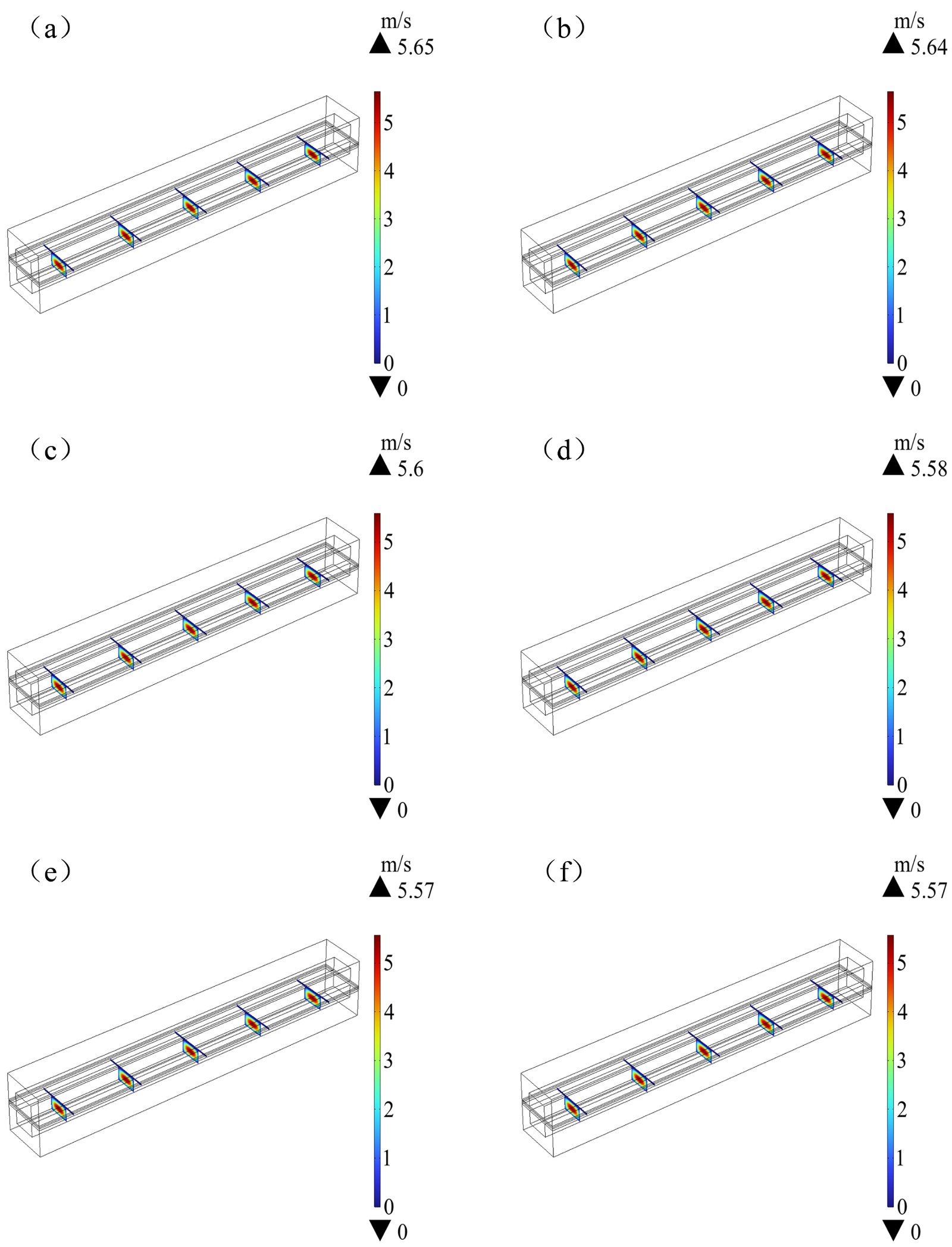 合理的气体流速分布可以显著提高电池的效率、稳定性和寿命。为研究固体氧化物燃料电池在不同极化电压下气体流速的变化趋势,在压力为1.0133 × 105 Pa,氢气和氧气的初速度均为3 m/s,其他参数如表2所示。改变极化电压(0.1、0.2 k、0.3、0.4、0.5、0.6)进行计算,阳极氢气流速仿真结果如图8所示。