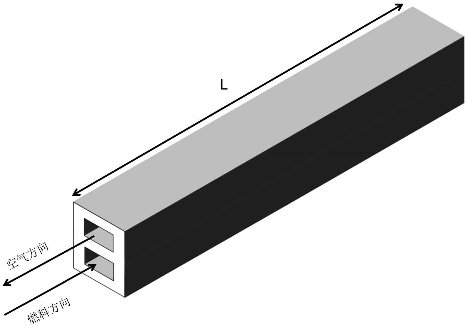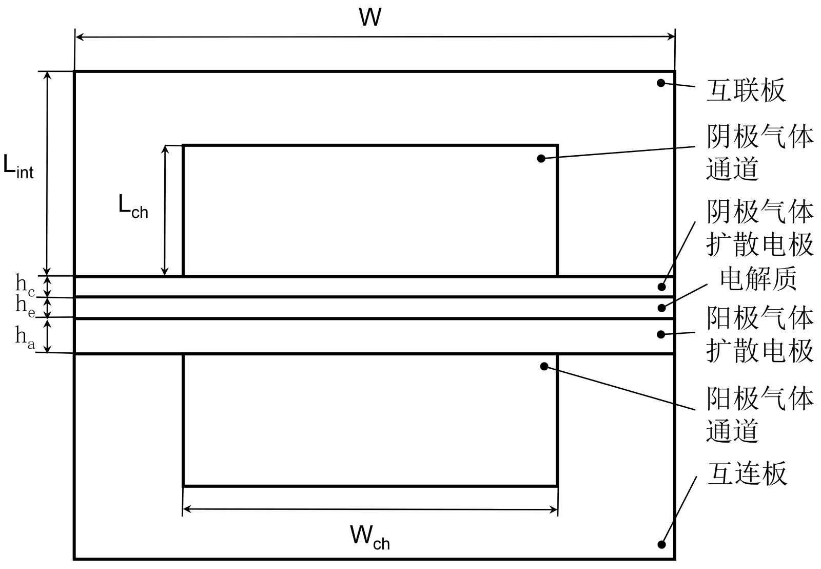 上述文献虽然从不同角度研究了极化对SOFC性能的影响,但面对电池内部复杂的物理化学过程,未能对不同极化电压下电池内部状态进行系统性研究。因此,本文以平板式SOFC单体电池为研究对象,在电化学反应场、流体流动场、物质浓度场和传热场四场耦合条件下,分析工作状态下极化电压对固体氧化物燃料电池电流密度、气体浓度、气体流速及温度的影响规律,旨在为SOFC的结构与性能优化设计提供理论支持。