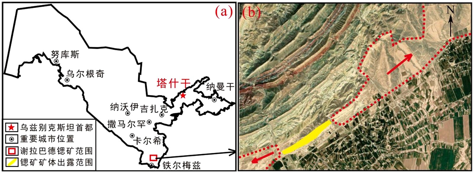 图1. 乌兹别克斯坦国谢拉巴德锶矿床位置(a)及出露范围(b)