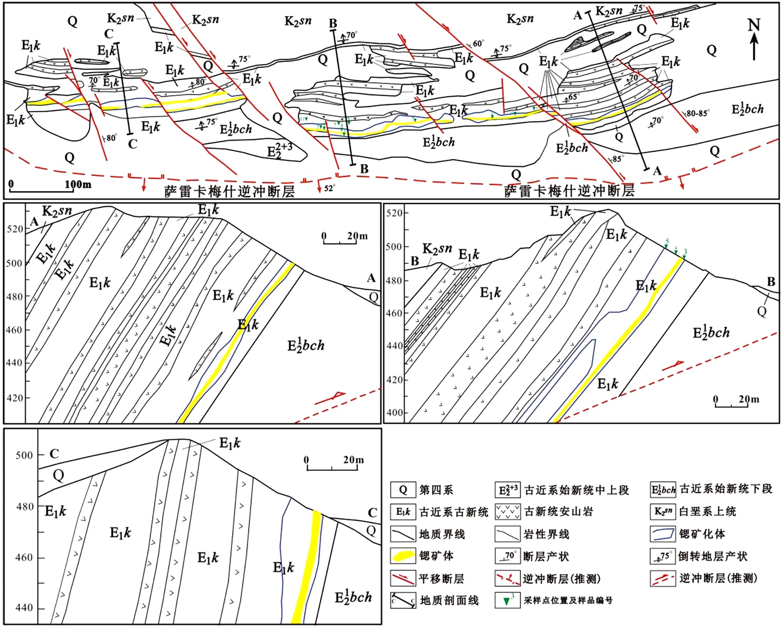 谢拉巴德锶矿床位于谢拉巴德–萨雷卡梅什隆起带中部,受萨雷卡梅什逆冲断层影响,矿区及外围发育倒转背斜,矿区位于倒转背斜的东南侧。萨雷卡梅什逆冲断层形成过程中,伴生一系列近EW向、NWW向右行平移断层。