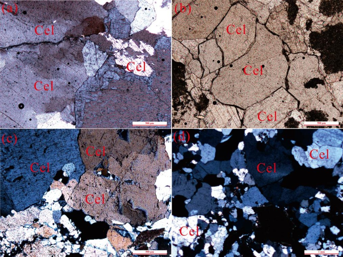 显微镜下,天青石呈现平行的片状(图4(a)、图4(b)和图4(c))、半自形晶粒状(图4(b)和图4(c))、角砾状和不规则粒状(图4(d)),片与片之间的接触界线较平直。天青石集合体多呈半自形柱状结构和粒状镶嵌结构(图4)。