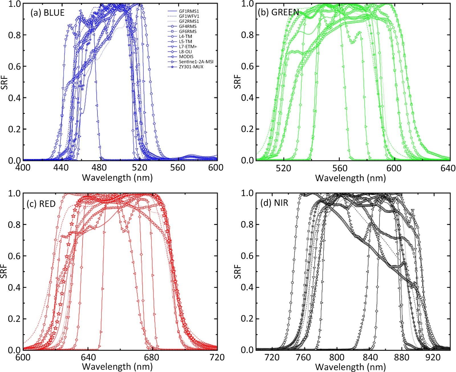 光谱响应函数是星载传感器成像过程中的重要参数,它描述了在不同波长范围内的辐射响应程度,也被成为波段响应函数、狭缝函数,是波长的函数[14] [15]。不同的卫星由于其观测目标、观测任务有所差异,使得其搭载的光学传感器也各有特点,不同传感器的差异性体现在波段宽度、中心波长位置等由此导致其光谱响应函数有所差别,而同一系列的传感器由于其硬件的老化等原因也会导致其光谱响应函数的细微不同。选取的传感器在蓝、绿、红、近红外波段的光谱响应函数对照图如图1所示。