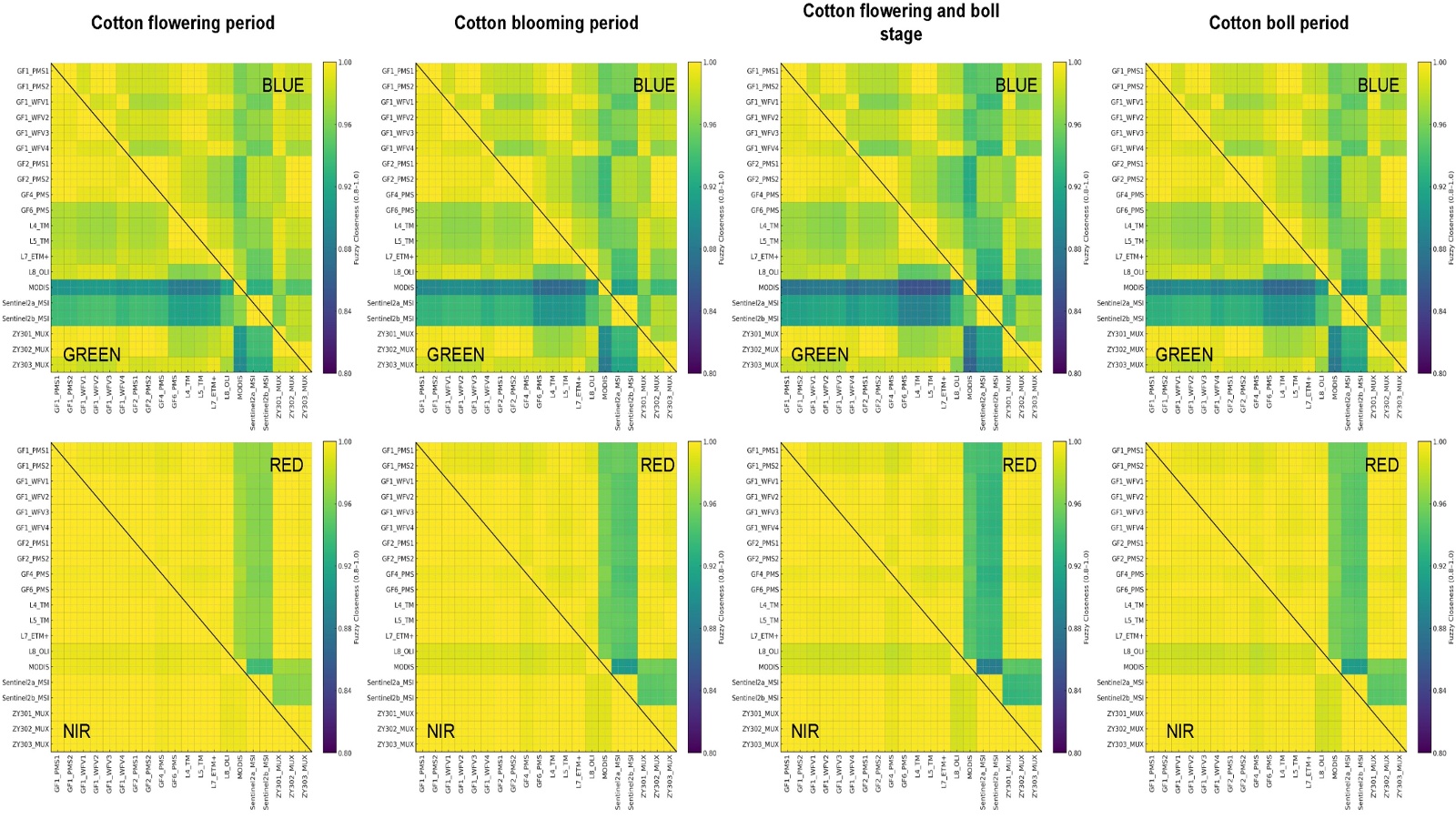 为系统评估不同卫星传感器光谱响应函数差异对棉花模拟反射特性的影响,本研究选取盛蕾期、盛花期、花铃期及盛铃期四个典型物候阶段,基于地面高光谱反射数据与多源传感器响应函数的卷积模拟结果,计算了各传感器在蓝、绿、红及近红外波段的模糊贴近度矩阵。模糊贴近度用于定量衡量不同传感器波段响应结果之间的相似程度,其取值范围为0~1,值越接近1表明波段间光谱响应越一致,值越低则反映出传感器间存在较明显的响应差异。