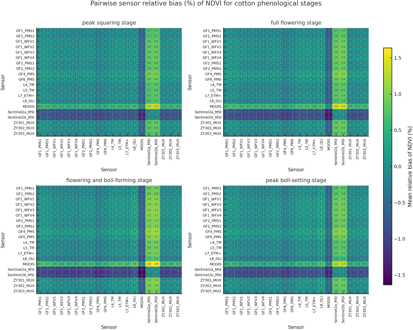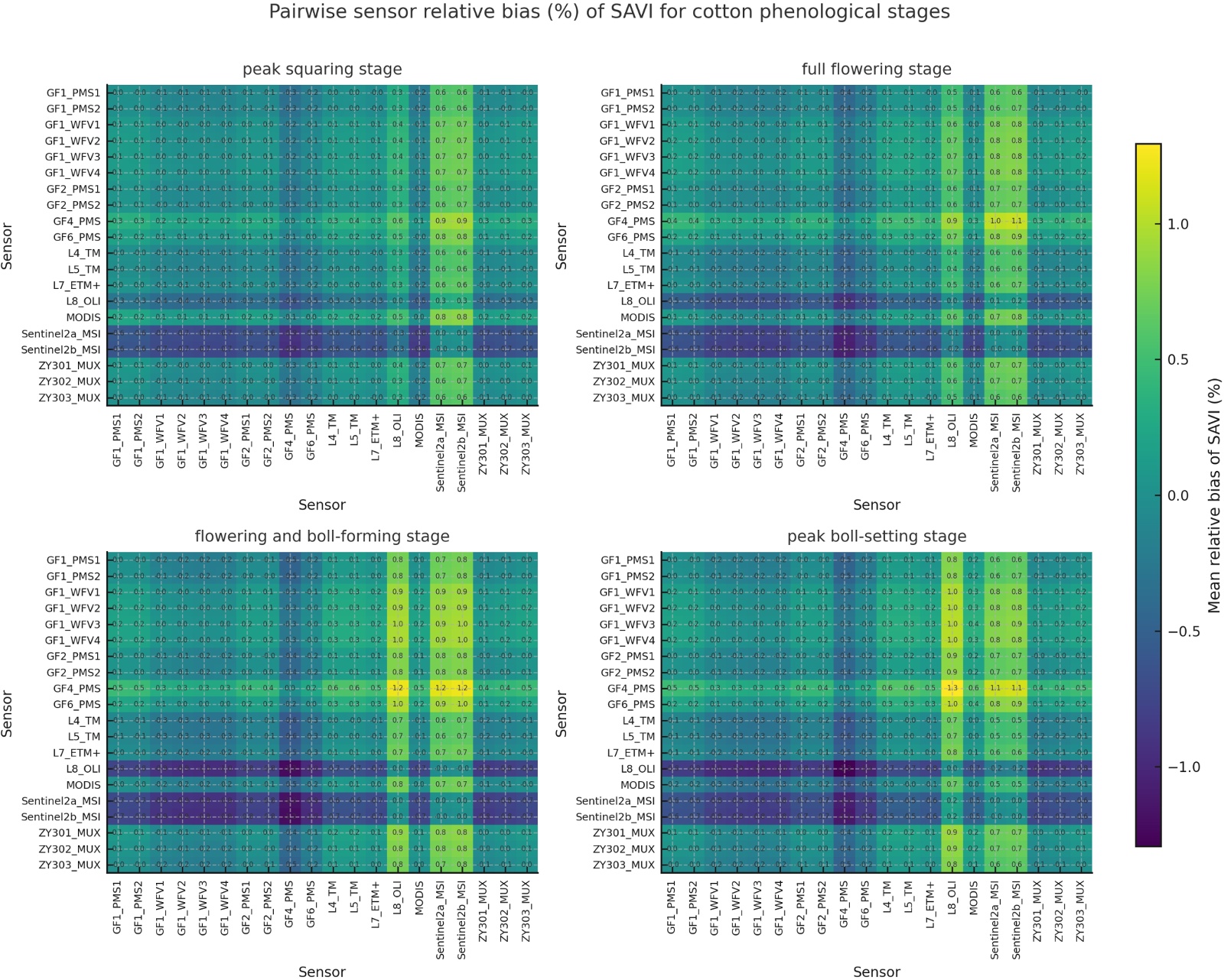 如图5,SAVI的相对偏差整体水平与NDVI相近,略高但仍明显低于EVI。四个物候期的平均绝对相对偏差分别为约0.23%、0.28%、0.33%和0.33%,呈现出由盛蕾期向花铃期、盛铃期逐渐增大的趋势。最大绝对相对偏差则分别约为0.95%、1.08%、1.23%和1.29%,整体控制在±1.3%之内,其中花铃期和盛铃期略高。具体来看,SAVI最大偏差主要发生在GF4_PMS与Sentinel2b_MSI或L8_OLI等传感器组合中,花铃期和盛铃期GF4_PMS与L8_OLI的平均相对偏差分别约为1.23%和1.29%。除上述少数组合外,GF系列其他载荷、Landsat_ETM+、MODIS以及Sentinel2a_MSI与多传感器之间的SAVI相对偏差大多集中在±1%以内。矩阵整体呈现出与NDVI类似的结构特征,对角近零、非对角元偏差缓慢增加,说明在SAVI层面,多数多光谱配置之间的指数估计仍然保持良好的一致性。