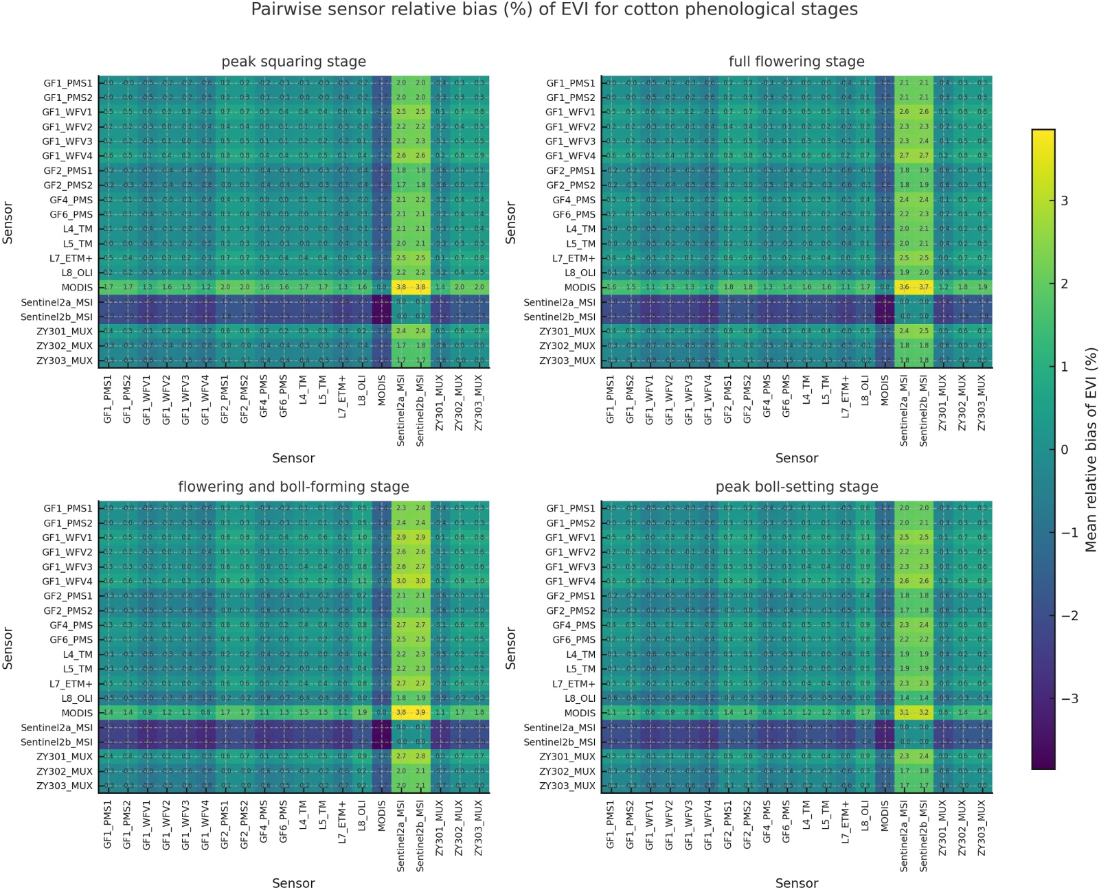 EVI的相对偏差矩阵整体数值略高于NDVI,表现出更强的指数敏感性。如图4,在盛蕾期和盛花期,所有传感器对的平均绝对相对偏差分别约为0.78%和0.79%;花铃期达到约0.87%,为四个物候阶段中最高;盛铃期略有回落,为约0.76%。各物候期的最大绝对相对偏差分别约为3.80%、3.69%、3.85%和3.17%,明显高于NDVI对应的1%~2%水平。其中,EVI最大偏差同样主要集中在MODIS与Sentinel2b_MSI组合,在盛蕾期、盛花期和花铃期的相对偏差接近±3.7%~3.9%,盛铃期略低但仍在±3.2%左右。相比之下,GF系列内部以及GF与Landsat系列之间的EVI相对偏差大多维持在±1%左右,明显低于上述跨平台组合。该结果表明,在三种指数中,EVI对多传感器反射率细微差异更为敏感,尤其是在花铃期,少数传感器组合在EVI层面的相对偏差可接近4%。