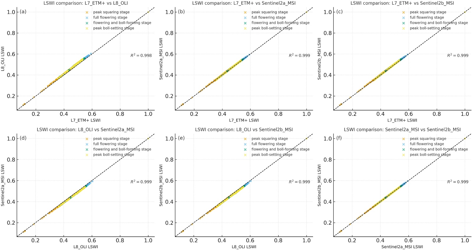 Figure 6. LSWI comparison among sensor pairs across four cotton growth stages. Panels (a)~(f) correspond to the index scatter relationships of L7_ETM+-L8_OLI, L7_ETM+-Sentinel-2A MSI, L7_ETM+-Sentinel-2B MSI, L8_OLI-Sentinel-2A MSI, L8_OLI-Sentinel-2B MSI, and Sentinel-2A MSI-Sentinel-2B MSI, respectively
