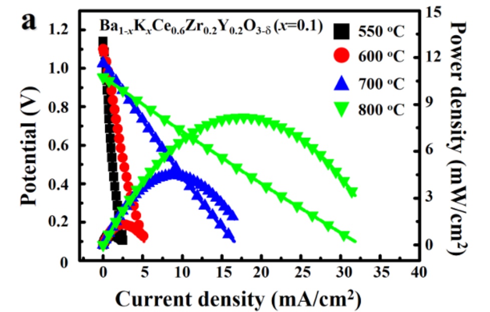Figure 1. I~V curves and power density outputs of Pt/Ba1−xKxZr0.1Ce0.7Y0.2O3−δ/Pt single cells, in which the electrolytes were (a) x = 0 and (b) x = 0.1 (CE-4), respectively. The measurements were performed in the temperature range of 550˚C~800˚C. [6]