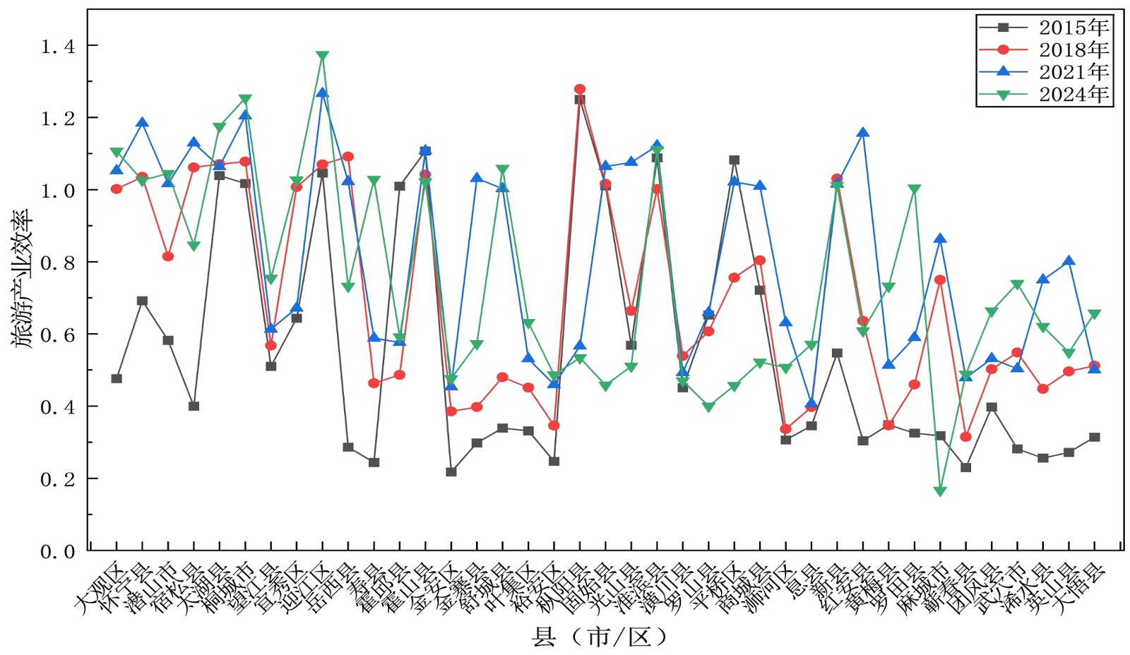旅游产业效率是指旅游业在特定生产技术和资源配置下,将各类生产要素(如资本、劳动力、资源)转化为旅游产出(如旅游收入、接待人次)的有效程度,其核心是衡量投入与产出之间的转化效率[10],马晓龙与保继刚(2010)将旅游效率定义为“旅游经济将一个特定城市作为生产单元,在时间一定的情况下达到的单位要素投入产出最大化”[11]。国外学者多就旅行社、酒店、旅游交通等微观范畴研究旅游产业效率[12];而国内普遍采用DEA和Malmquist指数[13]、DEA拓展模型[14]定量测度旅游产业效率,并进一步延伸探究旅游产业效率的空间分布及演化规律。