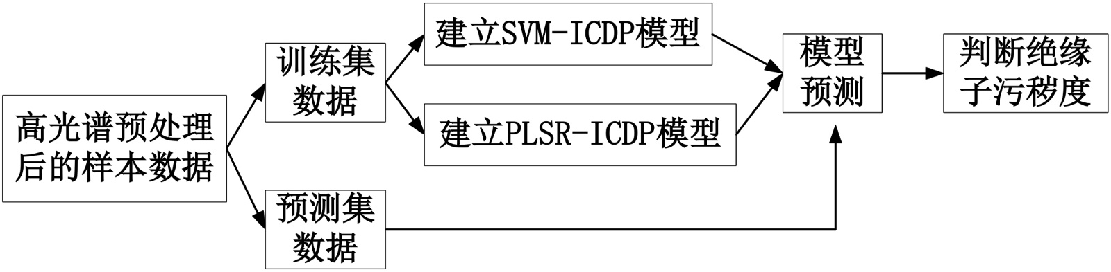 针对绝缘子的特点,提出基于高光谱图像的黑白标定和预处理方法。在现有标签数据的基础上,构建并验证了SVM-ICDP和PLSR-ICDP模型,具体流程见图2。