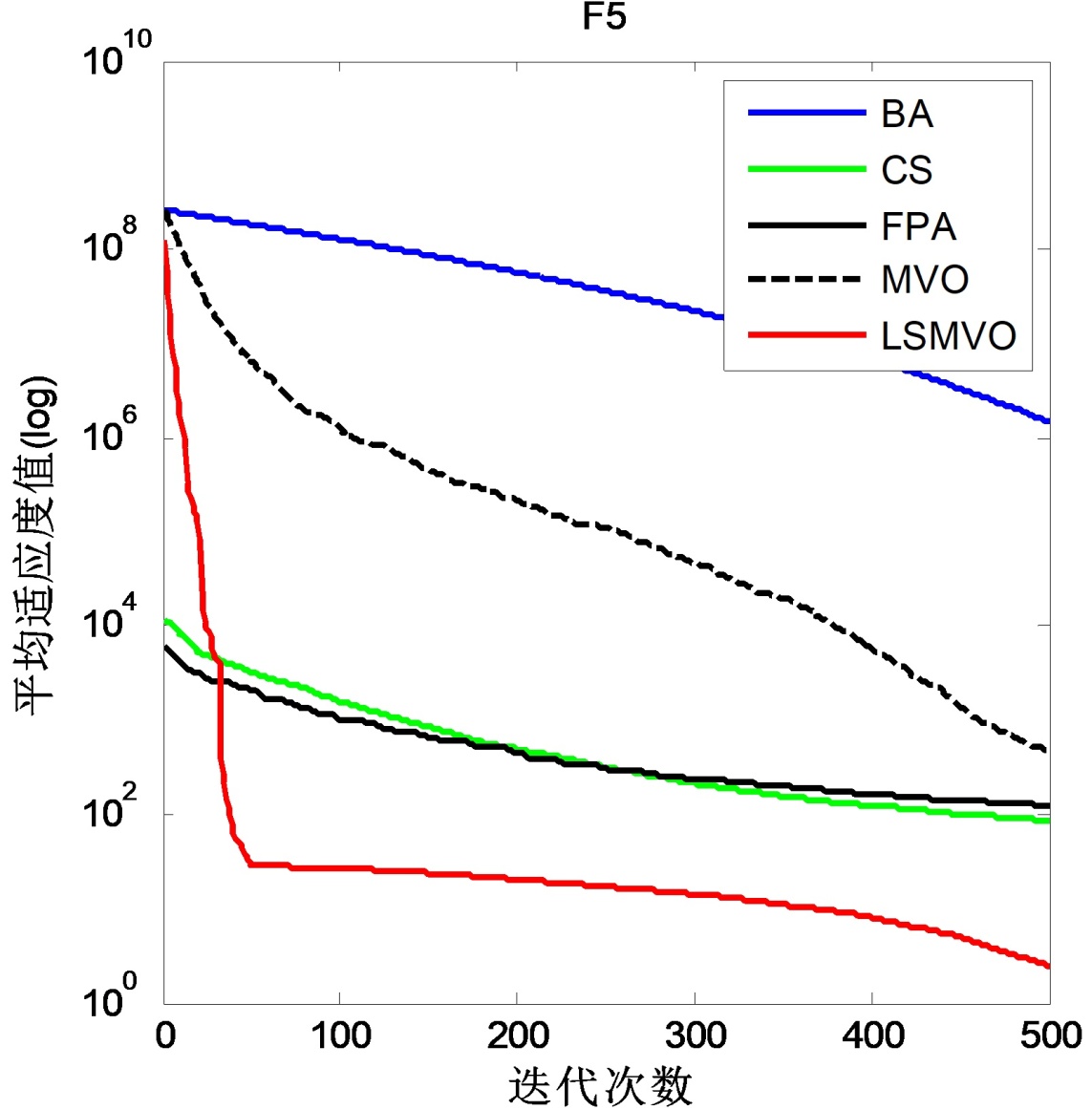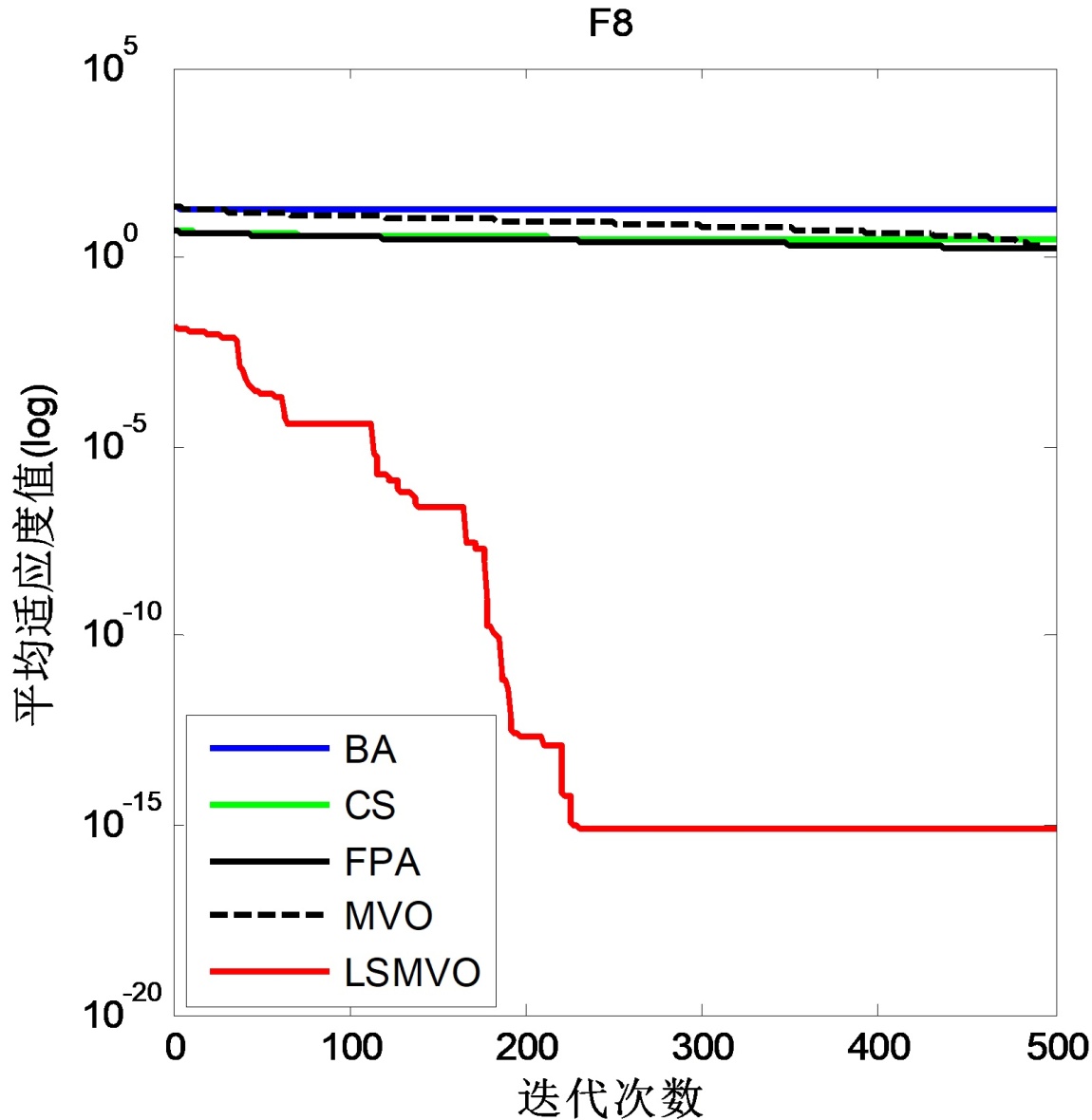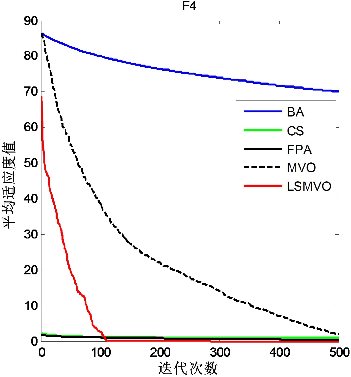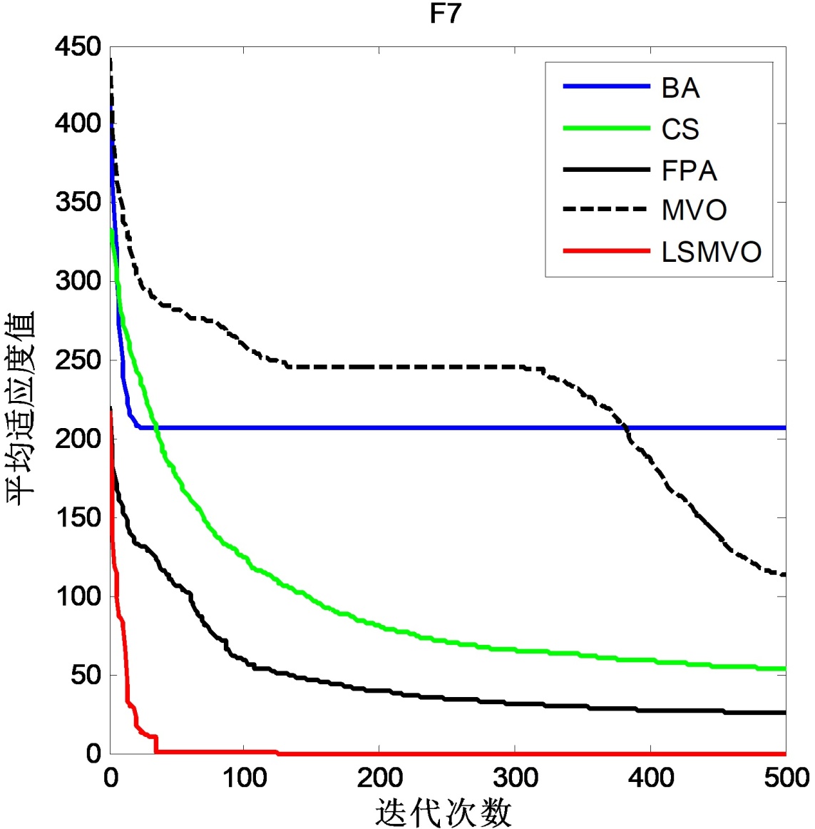 从图3~13可以进一步验证LSMVO的优越性。从图3、图4、图5、图10可以看出,当其他算法已接近收敛状态时,LSMVO仍保持继续寻优的能力。上述函数优化结果表明,加入单纯形法和Lévy飞行策略的LSMVO在函数优化中展现出较强优势,其测试结果更接近理论最优值,证实了该改进算法在函数优化问题中的可行性与有效性。