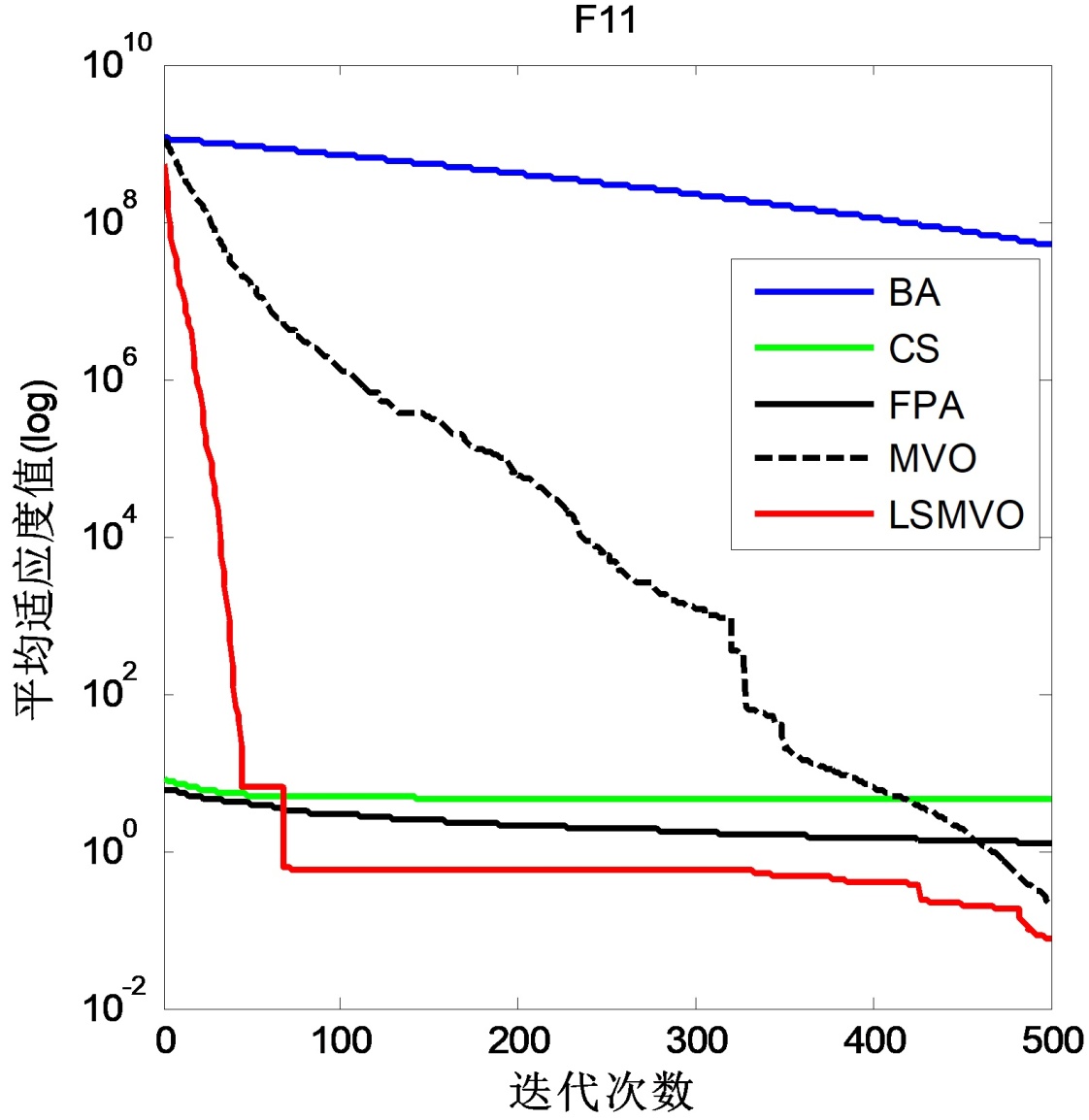 为了验证LSMVO算法的有效性与可行性,文中采用11个基准测试函数来验证其性能。在此次仿真实验中,用到了蝙蝠算法(BA)、布谷鸟算法(CS)、花授粉算法(FPA)。其中MVO和LSMVO算法中种群规模为30,最大迭代次数为500次,函数维数设置为30维,最后采用独立运行20次最优值的平均值作为测试结果。对于FPA,参数设置为p = 0.8,参数研究表明,p = 0.8对于大多数应用具有较好的效果;对于CS,巢数设定为N = 30,外来蛋的发现率设定为p = 0.25;对于BA,脉冲频率范围设置为Q = {0,2},最大响度设置为A = 0.5,最大脉冲发射设置为R = 0.5,响度衰减系数设定为C = 0.95,脉冲发射增加系数设定为C = 0.05。