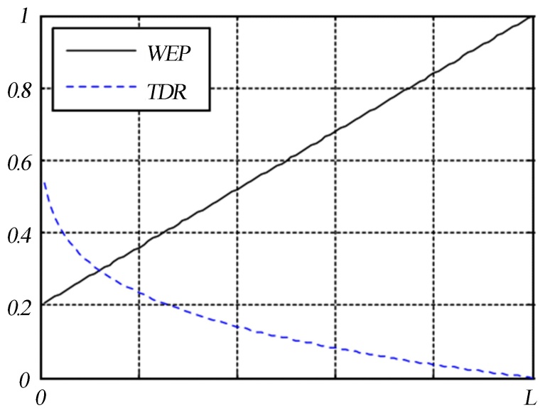 Figure 1. Wormhole existence probability versus travelling distance rate