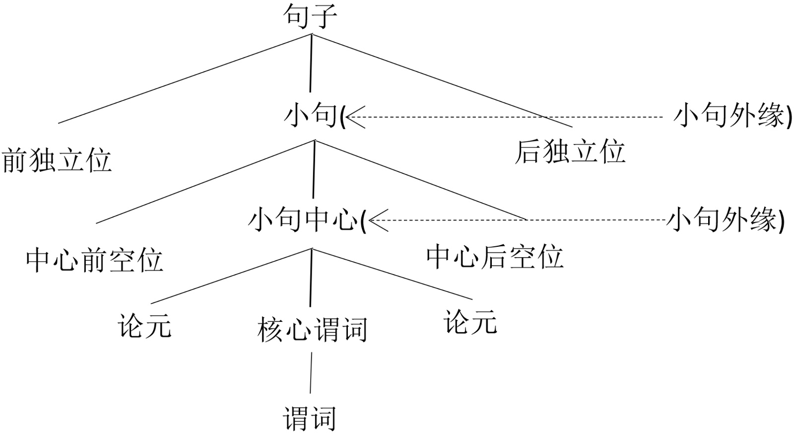 该小句模型由三个层次组成:(1) 核心谓词(nucleus);(2) 由核心谓词及其论元(argument)组成的小句中心(core);(3) 附属于小句中心的小句外缘(periphery),由表时间、地点等的修饰语组成。小句则由小句中心和小句外缘组成。有些语言的小句中还有中心前的空位(pre-core slot, PrCS)和中心后的空位(post-core slot, PoCS),以及前独立位(pre-detached position, PrDP)和后独立位(post-detached position, PoDP),也就是小句前后独立成分所出现的位置。在核心谓词、小句中心和小句这三个层次中,每一层都由一个或一个以上的功能元(operator)来管辖。管辖核心谓词的功能元一般是体(aspect),可以把复合核心谓词的所有成分置于它的辖域中;管辖小句中心的功能元一般是情态(modality),把中心所属的成分置于它的辖域中;管辖小句的功能元主要是时态(tense)和言外之意(illocutionary force)等。由此可见,功能元不仅包括了时态、体、情态等语法范畴,还包括了“言外之意”等语义和语用范畴。