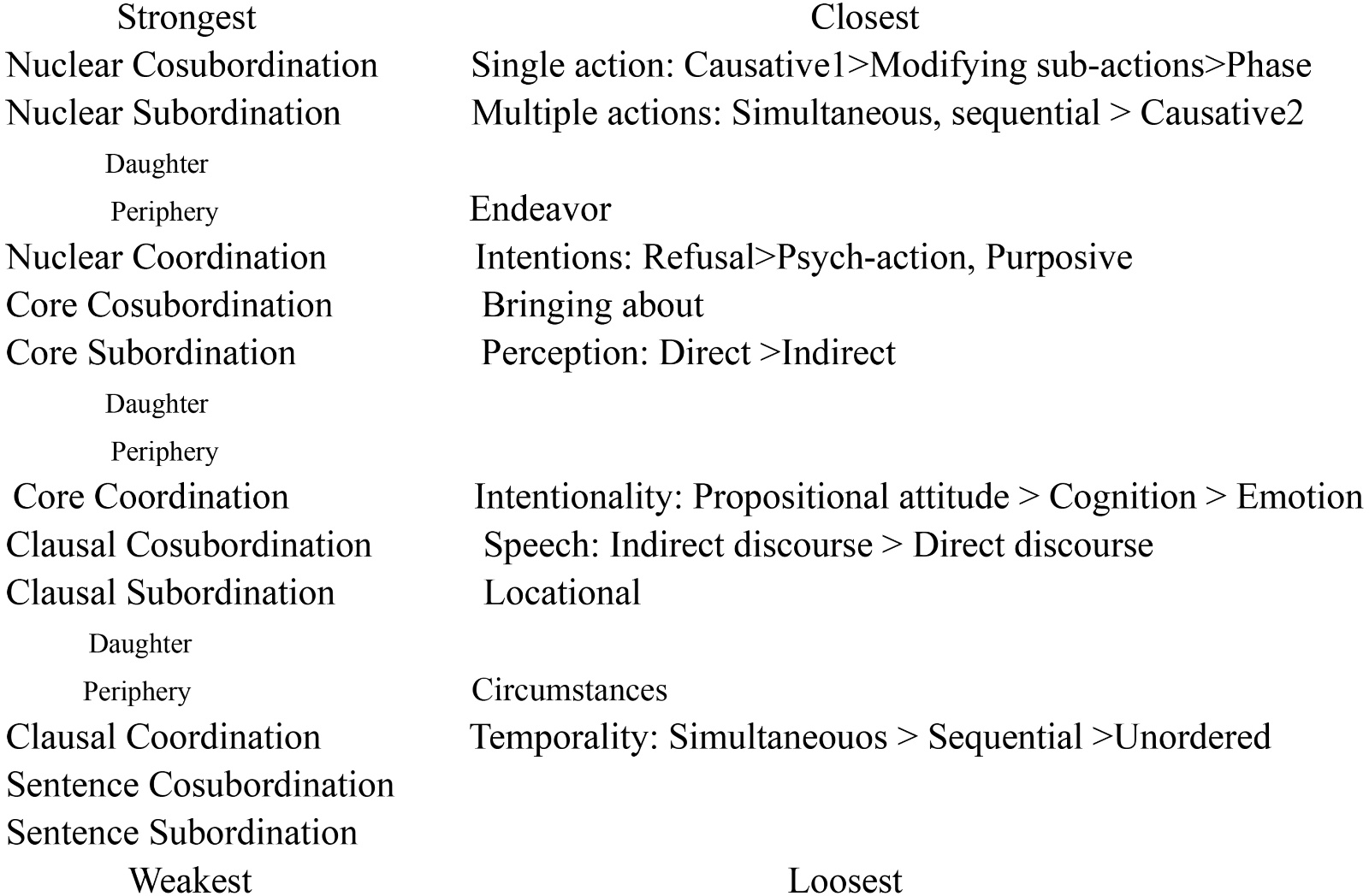 四种连接与三种关系两两组合,可能生成十二种复合句型,但由于RRG模型中没有句子层面的功能元,而并列从属关系又要求组成单位之间必须有功能元共享,因此,排除掉句子层面的并列从属关系,RRG模型中共有十一种复合句型。这十一种类型的句法连接关系按照结合的疏密程度可以排列成一个等级,而句子中不同成分之间的语义关系也可以按照疏密程度排出一个等级。根据句法关系与语义关系之间的对应情况,可以得到图4的层级图。