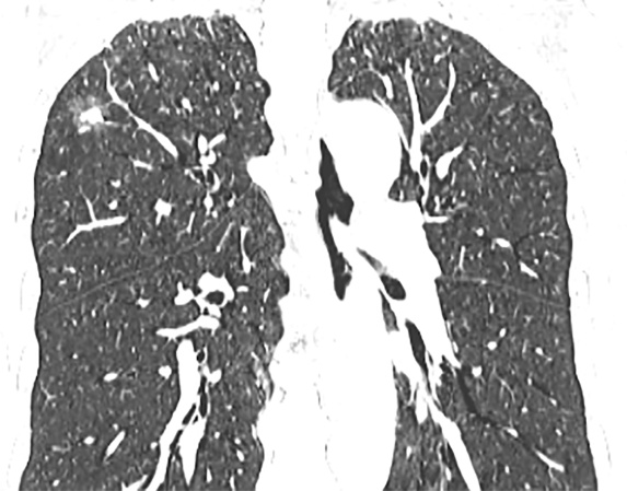 图1. STAS阳性肺腺癌患者,男,57岁。横轴位(a)、冠状位(b)、及矢状位(c) CT图像示右肺上叶部分实性结节,边界清晰,内可见实性成分,周边可见分叶征