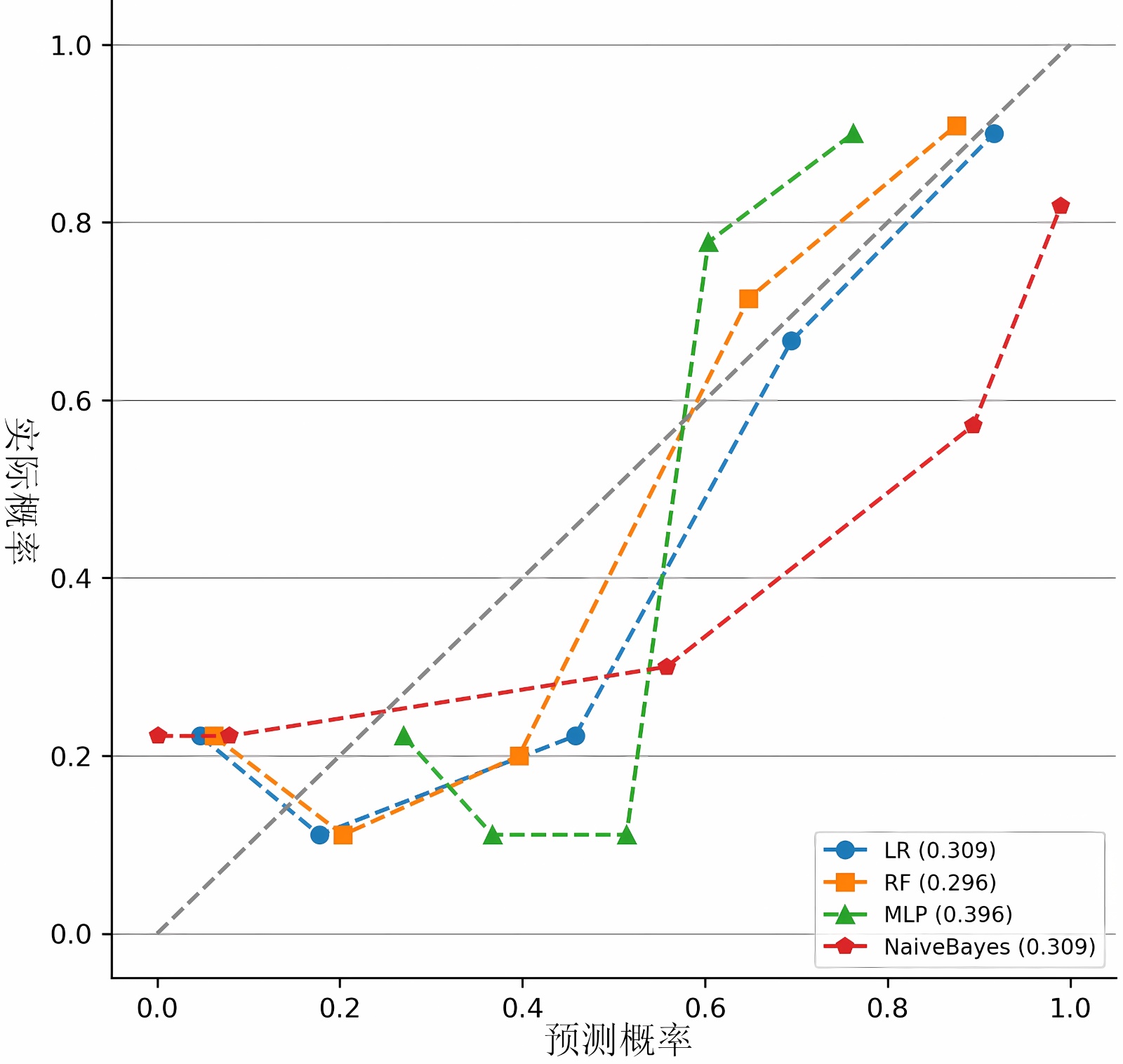 图2. 验证组中不同机器学习模型的校准曲线。LR,逻辑回归;RF,随机森林;MLP,多层感知器