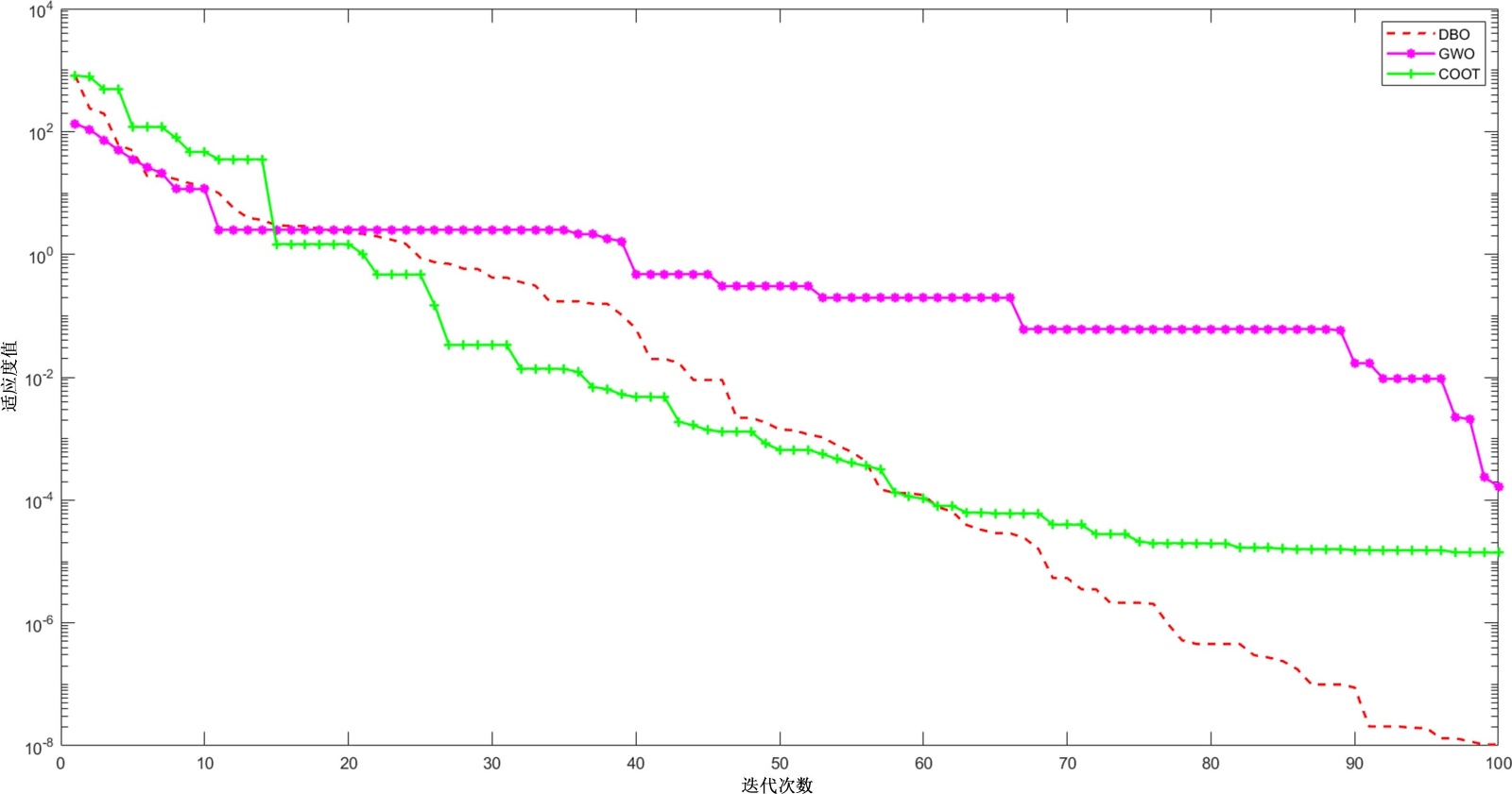 利用蜣螂算法(DBO)、灰狼优化算法(GWO)、白骨顶鸡优化算法(COOT)求解的迭代曲线图2所示。计算结果如表1所示。蜣螂算法与其他两个算法相比计算精度更高,迭代速度更快。