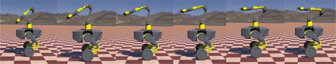 稳定性[2]-[4],但越障与地形适应能力有限[5];腿足式机器人擅长在非结构化环境中通行,具备较强的地形适应能力[6]-[9],但能耗较高、运动不连续[10]。双轮腿机器人兼具轮式和足式机器人的优点,成为了移动机器人领域的一个重要研究方向。典型成果包括苏黎世联邦理工学院(ETH Zurich)的Klemm V等人为小型双轮腿机器人Ascento设计了辅助LQR全身控制方法[11]。该控制方法的核心为多任务规划部分,将各种运动任务,包括躯干站高、横滚、航向任务以及LQR任务(平衡任务)作为约束条件,规划一组关节期望加速度。爱丁堡大学的Xin S等人对双轮腿机器人的规划方法[12]是基于简化的小车线性倒立摆模型构造模型预测控制器,以质心参考速度为输入,规划满足ZMP判据的轮地接触点以及CoM位置。执行层基于全身动力学模型将关节运动映射为关节力矩。在仿真环境中实现了轮式运动加减速与行走运动跨越障碍的实验验证。南方科技大学研制的双轮腿机器人NeZha [13]站高约89 cm,采用基于轮式弹簧负载倒立摆(W‑SLIP)模型并结合二次规划的轨迹生成方法,通过分层控制框架实现了行进跳跃的仿真验证。印度理工学院(IIT Kharagpur)的Bhavanibhatla K等人对六足移动机械臂的在线全身运动规划方法[14]是基于非线性约束优化进行冗余分解,通过实时求解一个以最小化关节变量加权变化为目标、同时满足末端位置精度与可操作性约束的优化问题,来协调规划机械臂关节与移动平台的运动。该方法结合自适应步长策略动态调整躯干运动步长,以保证机械臂始终远离奇异位形,最终在仿真与实物平台上实现了用户通过操纵杆实时操控末端轨迹的无奇异全身协调运动。
