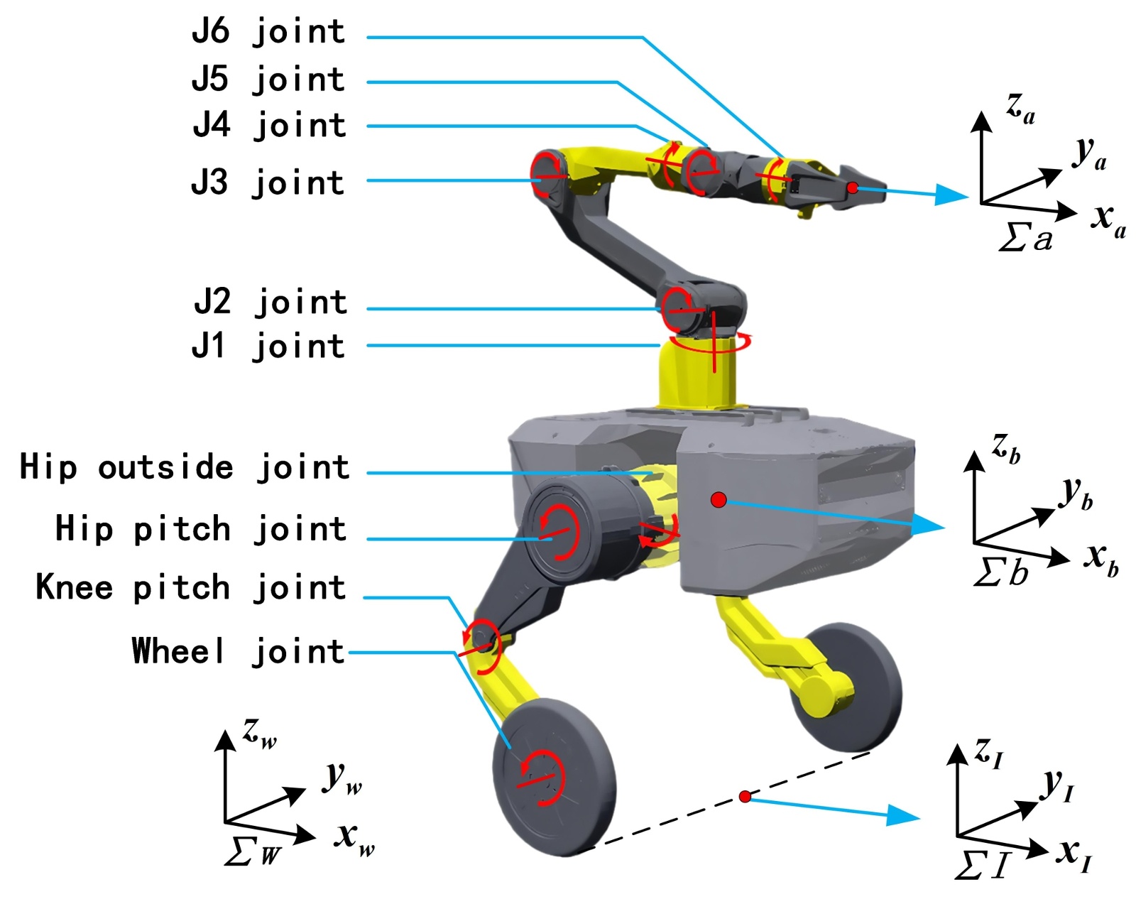 本文以TITA-PiPER双轮腿–单臂机器人为研究对象,其三维模型如图1所示。该平台由本末科技(DirectDrive Tech)研发的TITA双轮腿机器人与松灵科技(AgileX Robotics)研发的6自由度轻量级机械臂PiPER集成构成。其中,TITA机器人的单侧轮腿结构包含四个自由度,分别由髋外摆关节、髋俯仰关节、膝俯仰关节以及轮旋转关节提供,关节电机全部由一体化准直驱动模组驱动,单关节峰值扭矩可达120 Nm,具备高动态响应能力。PiPER机械臂则具备六个自由度,由六个集成关节电机独立驱动,总重量为4.2 kg,额定负载能力为1.5 kg。其他部分参数如表1和表2所示。