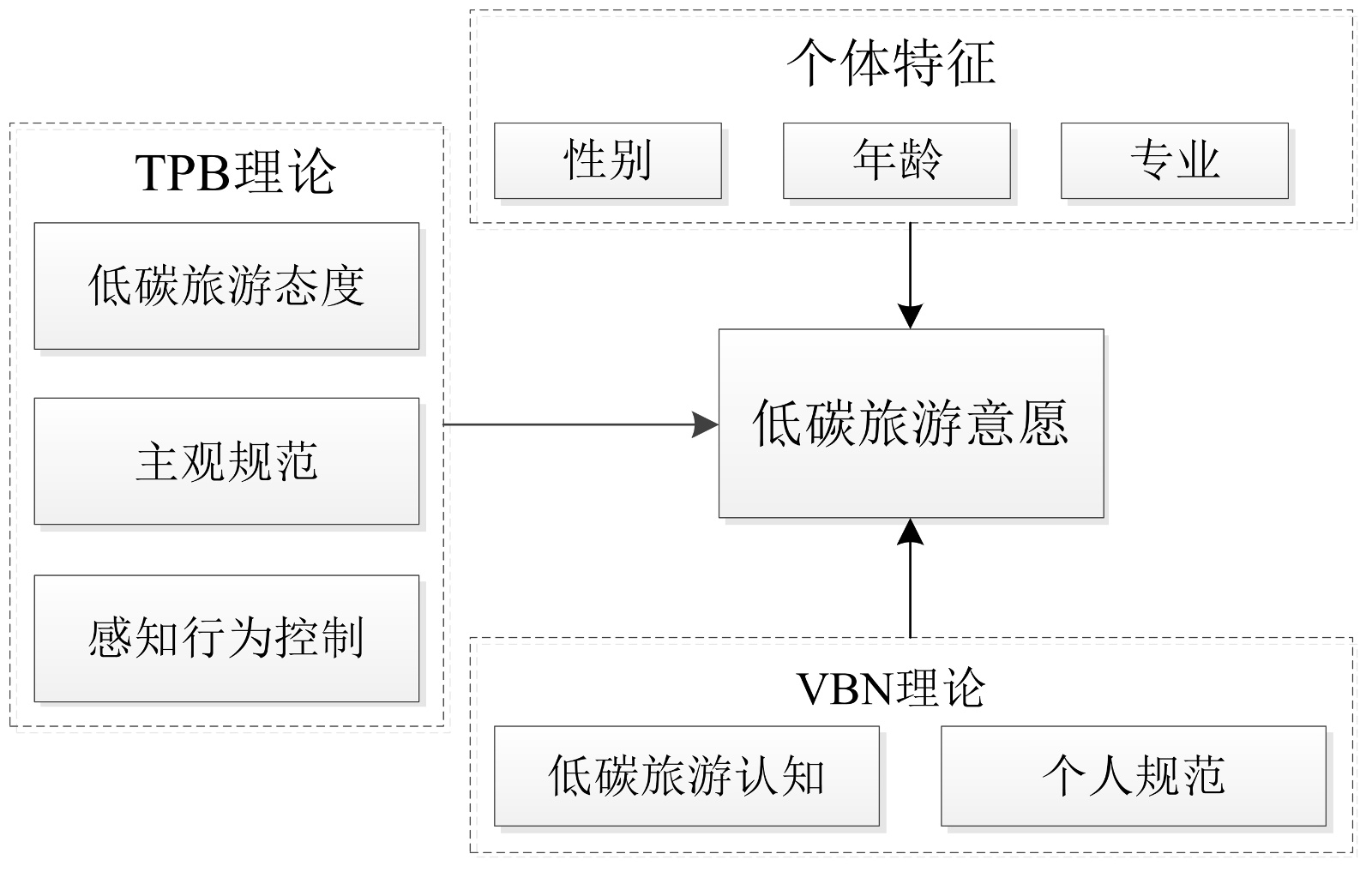 在行为意愿研究领域,TPB理论与VBN理论提供了互补的分析视角,本研究综合运用TPB和VBN两种理论视角来解释大学生低碳旅游意愿与行为的形成机制(图1)。整合模型包含因变量(低碳旅游意愿),自变量由个体特征(性别、年级和专业)和TPB和VBN两种理论整合变量(低碳旅游态度、主观规范、感知行为控制、低碳旅游认知和个人规范)。