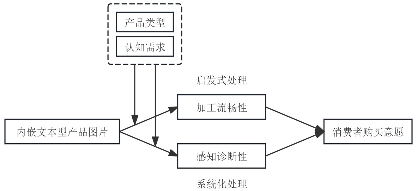 在电子商务环境中,内嵌文本型产品图片会同时唤起消费者的两种信息处理模式:启发式处理和系统化处理,进而对消费者的购买意愿产生双重影响。基于相关研究和现实场景,本文引入了加工流畅性和感知诊断性这两个构念来分别表征消费者在两条信息处理路径中的状态变化。产品类型和认知需求调节了内嵌文本型产品图片与消费者信息处理方式之间的关系。本文的研究模型如图1所示。