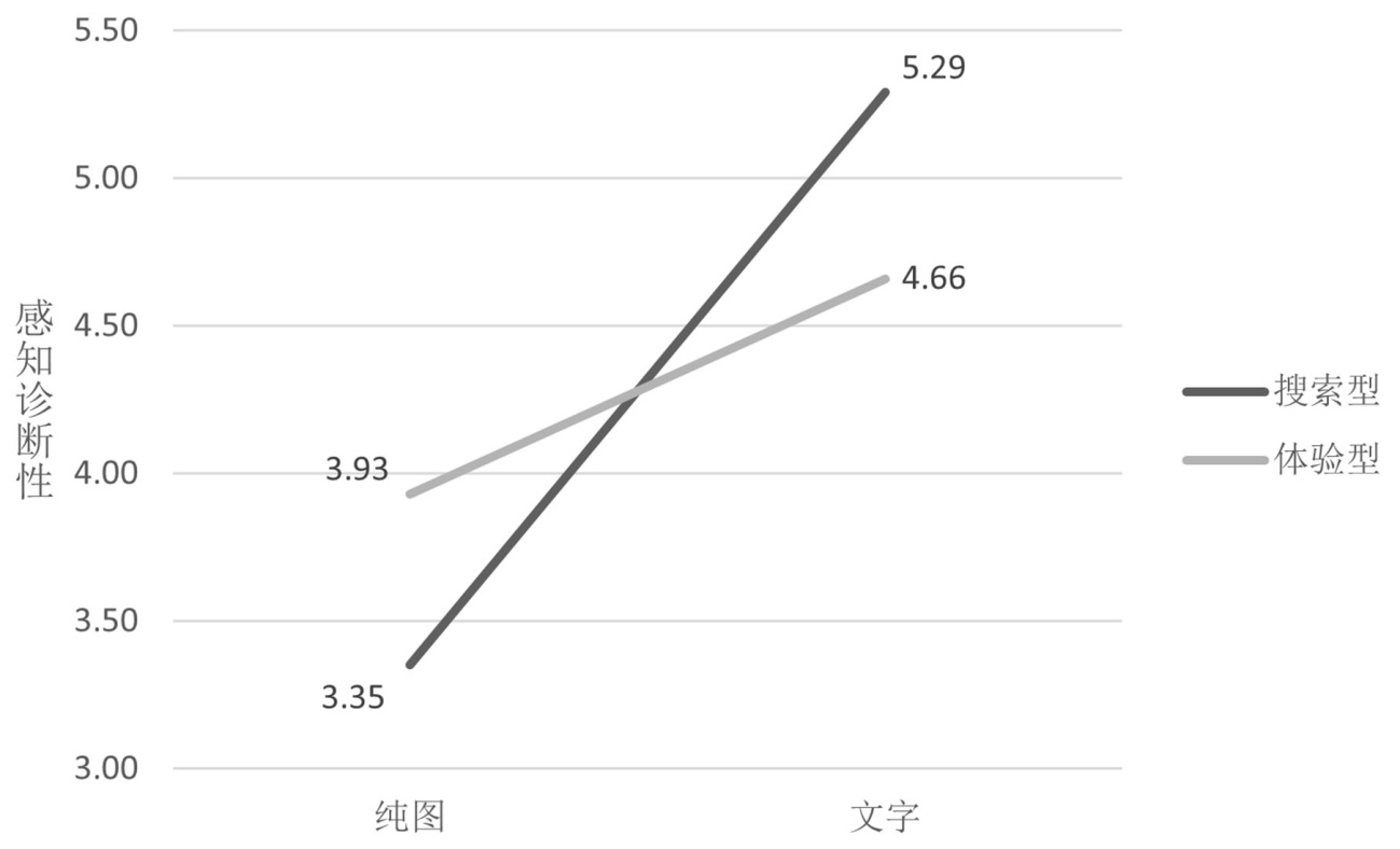 产品类型在文字嵌入对感知诊断性的影响中存在调节效应。本文发现产品类型调节了文字嵌入对消费者感知诊断性的影响(p < 0.01)。如图2所示,在体验型产品图片中嵌入文字,对消费者的感知诊断性具有显著正向影响(M文字 = 4.66, M纯图 = 3.93, p < 0.05);而在搜索型产品图片中嵌入文字,对消费者感知诊断性的正向影响更加显著(M文字 = 5.29, M纯图 = 3.35, p < 0.001)。没有发现产品类型在文字嵌入对消费者加工流畅性的影响中存在调节效应(p = 0.28)。