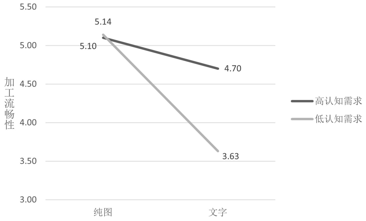 认知需求在文字嵌入对加工流畅性的影响中存在调节效应。本文发现认知需求调节了文字嵌入对消费者加工流畅性的影响(p < 0.05)。如图3所示,对低认知需求的消费者而言,在产品图片中嵌入文字对加工流畅性具有显著负向影响(M文字 = 3.63, M纯图 = 5.14, p < 0.001);但对高认知需求的消费者来说,在产品图片中嵌入文字对加工流畅性的影响不显著(M文字 = 4.70, M纯图 = 5.10, p = 0.26)。没有发现认知需求在文字嵌入对消费者感知诊断性的影响中存在调节效应(p = 0.55)。