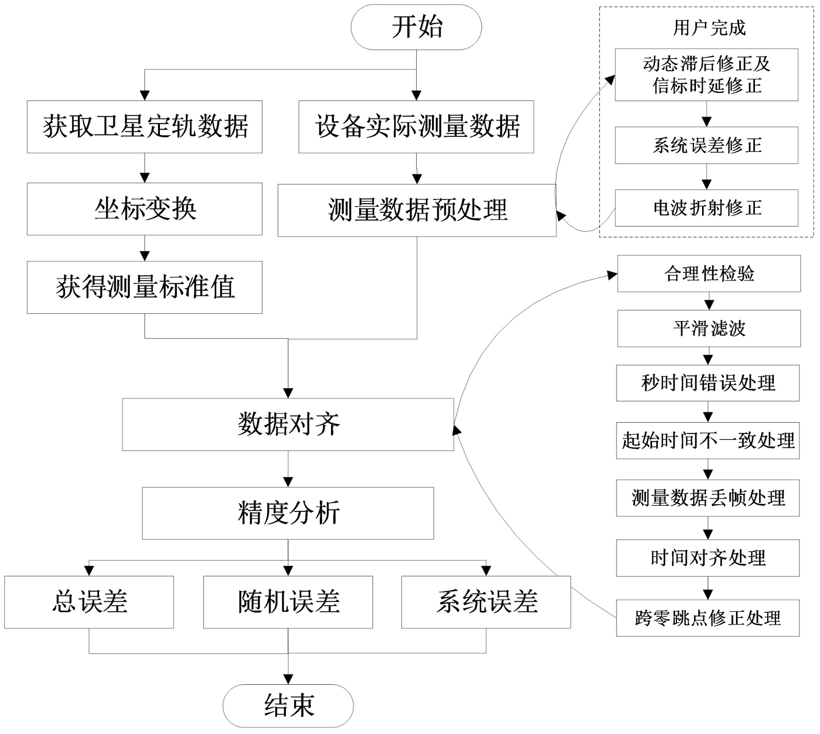 在数据处理过程中,涉及到了动态滞后修正、系统误差修正及电波折射修正,同时还要做数据对齐处理,包括数据合法性校验、平滑滤波、秒时间处理、丢帧处理等,其中有部分处理算法均为常见且较为通用的算法,不再赘述,主要对精度分析与误差估计算法进行介绍。