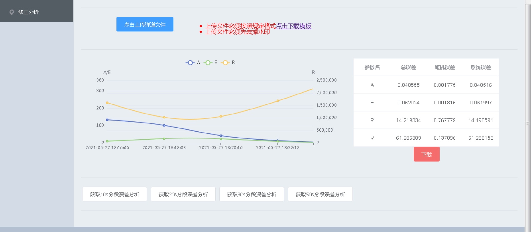 上传经过修正后的测量数据,根据弹道文件绘制的R、A、E图像,同时系统开始自动获取轨道数据,并对两组数据进行处理后,给用户提供A、E、R、V分别的总误差、随机误差、系统误差的精度鉴定结果及数据下载。如图8所示。