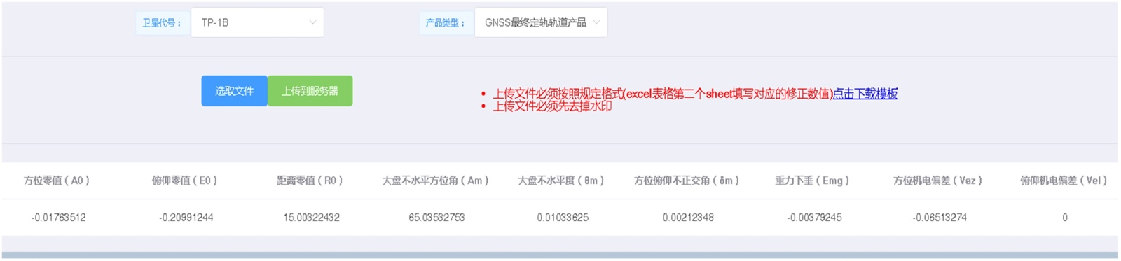同样,在精度优化功能实现上,也具备卫星类型及轨道产品类型的选择,文件上传支持单个及多个测量数据文件同时上传。完成上传文件后,系统对文件进行处理,并根据处理流程进行误差参数估算。并将估算结果显示于用户,如图9所示。估算参数包括:方位零值、俯仰零值、距离零值、大盘不水平方位角、大盘不水平度、方位俯仰不正交度、重力下垂、方位机电偏差、俯仰机电偏差。