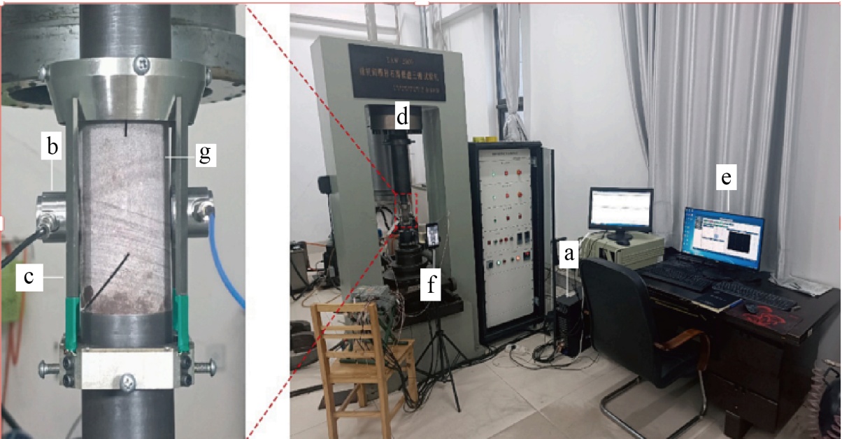 3) 为记录砂岩试样破坏过程裂纹的扩展情况,在砂岩试样的前方放置一台录像设备,如图2(f)所示。